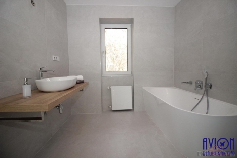 Ve všech pokojích bytu a na chodbách jsou vinylové podlahy, v obou koupelnách je dlažba. Zakázkové interiérové bezfalcové dveře s prosklením podtrhují moderní vzhled bytu. Nové rozvody elektřiny, vody a odpadů. Krásný slunný obývací pokoj 33 m2 se vstupem na prostornou terasu o výměře 31 m2 je na jihozápad, orientace ostatních pokojů o výměrách 10 až 17 m2 je na západ a severovýchod. Byt disponuje dvěma koupelnami, ve velké koupelně o výměře 7 m2 se nachází vana, sprchový kout a dvojumyvadlo, v další koupelně je sprchový kout a toaleta, další toaleta je samostatná.