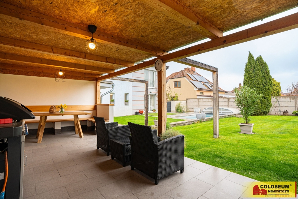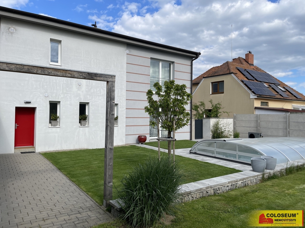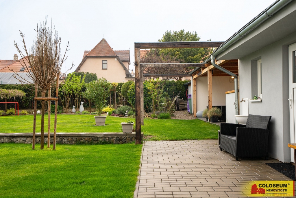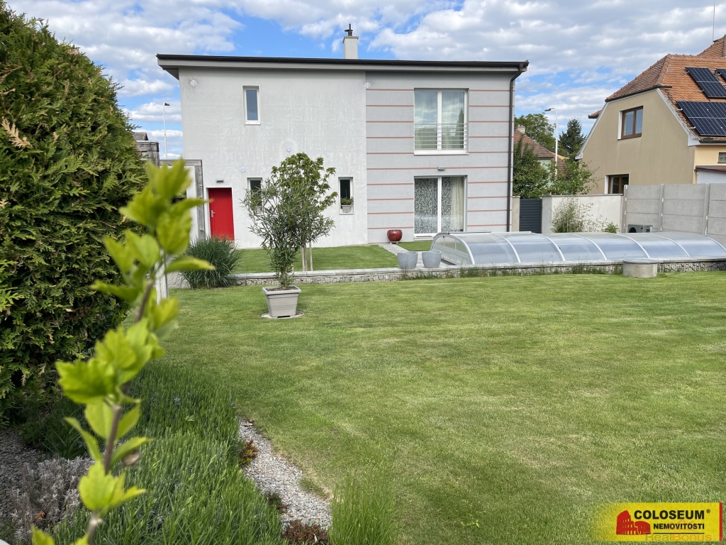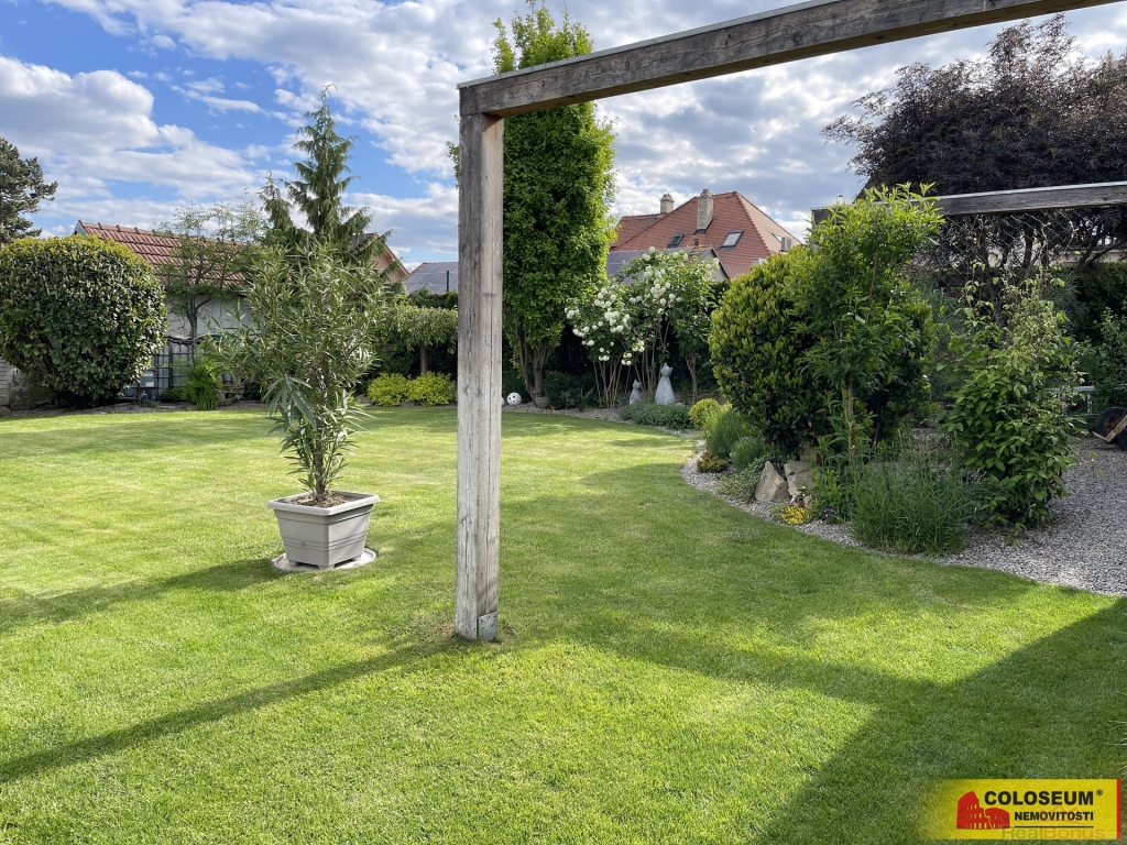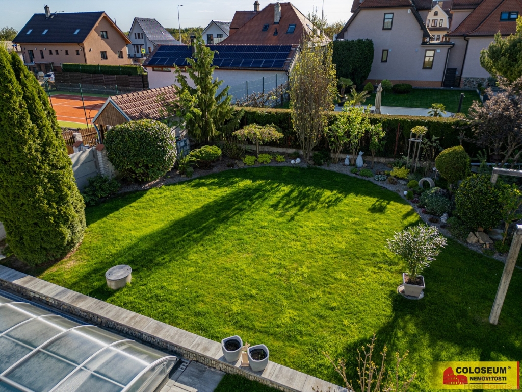 Na pozemku o výměře 760 m2 se nachází krásně udržovaná zahrada s okrasnými záhony. Zahradu a terénní úpravy navrhovala zahradní architektka. Užijete si bazén o rozměrech cca 6 × 3 m se slanou vodou a zastřešením, který jistě potěší během horkých letních dní. Díky tepelnému čerpadlu a vyhřívání si můžete užívat koupání i v chladnějších měsících. Filtraci ovládáte automaticky přes mobilní telefon. Na bazén navazuje terasa, která spojuje bazén s domem. K dispozici je také zahradní domek, letní kuchyň, automatický zavlažovací systém a příprava na instalaci solární sprchy ? to vše pro maximální pohodlí a úsporu energií. Parkování zajištěno v garáži a na vlastním pozemku - na parkovací plochu vedle domu vjedete bránou na elektrický pohon.
