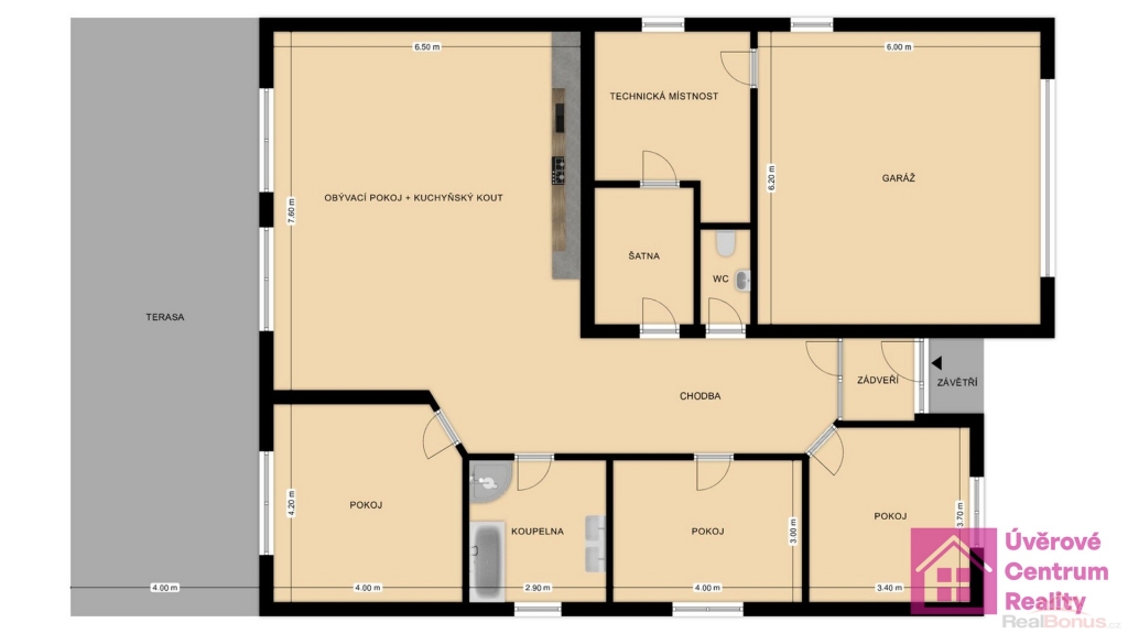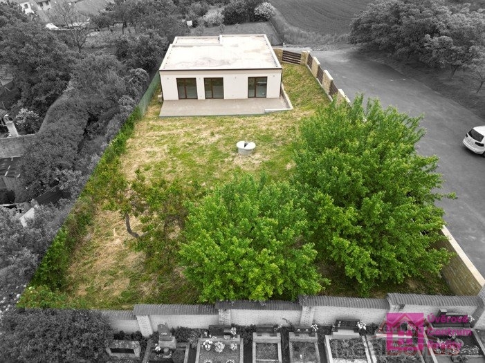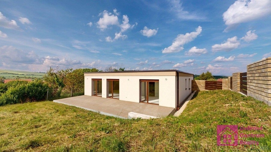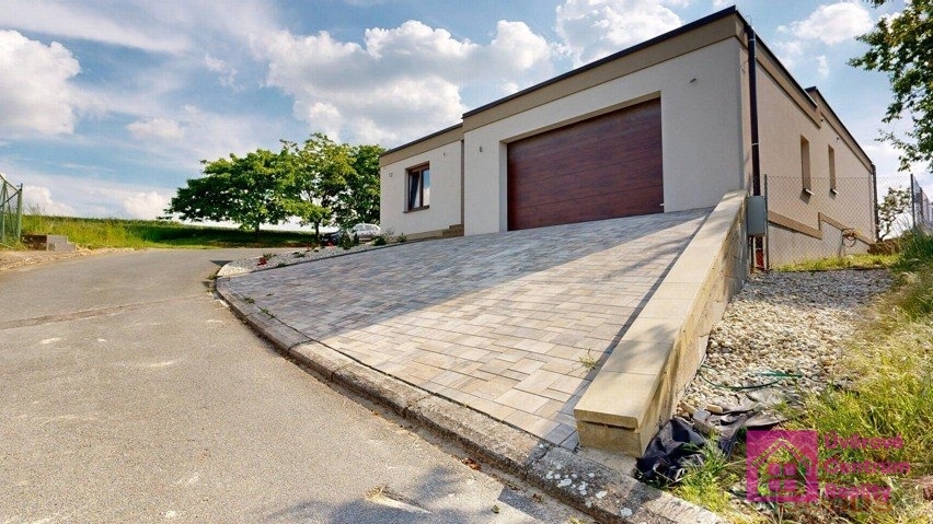 dvou garáž, technická místnost, šatna, chodba, toaleta, pokoj, pokoj, koupelna, pokoj, pokoj s kuchyňským koutem a terasa. Půdorys domu naleznete ve fotogalerii.