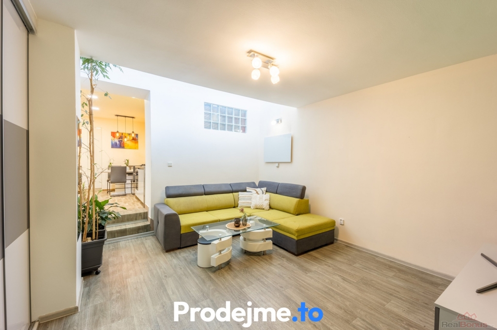 Připravena k celkové rekonstrukci s plochou 28 m2. Jde o původní prostory garáže, kde v rámci výstavby bytové jednotky došlo ke zvýšení podlahy a současně má platné povolení k náhradě garážových vrat za okno. V budoucnu může mít obývací pokoj, jídelnu s kuchyňským koutem a koupelnu s toaletou.