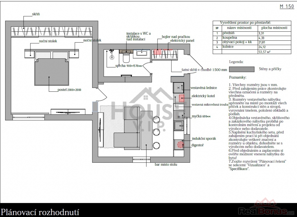 Dispozice bytu: byt se skládá ze vstupní chodby 3,31 m2, ložnice 24,12 m2, obývacího pokoje s kuchyní 21,81 m2 a koupelny 4,33 m2. Byt se prodává ve stavu s veškerým vybavením ale bez nábytku.