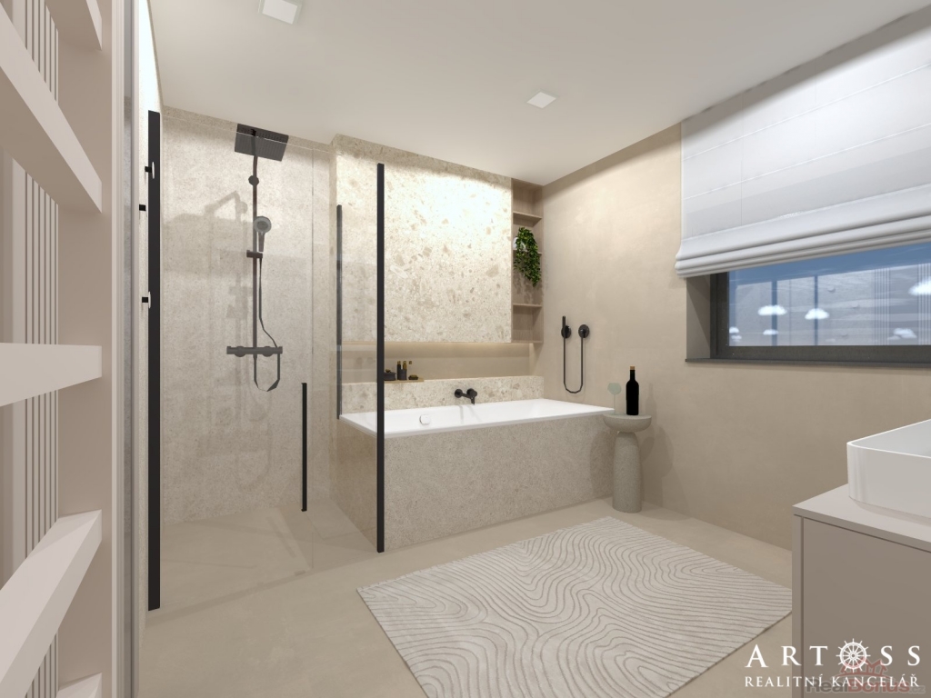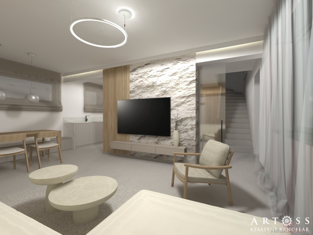 Nemovitost je ve fázi před kolaudací ? nový majitel má tak jedinečnou možnost dokončit interiér podle svých představ (podlahy, dveře, sanita, kuchyně atd.). Pro prezentaci jsou použity vizualizační fotografie přímo od architekta. Pokud zájemce tento interiér osloví, je možné dům v tomto provedení dokončit přímo od stavitele a nebo si může dům dokončit individuálně.