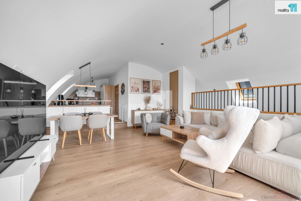 ve 4. NP obytný prostor s kuchyňským koutem, samostatný pokoj a WC.