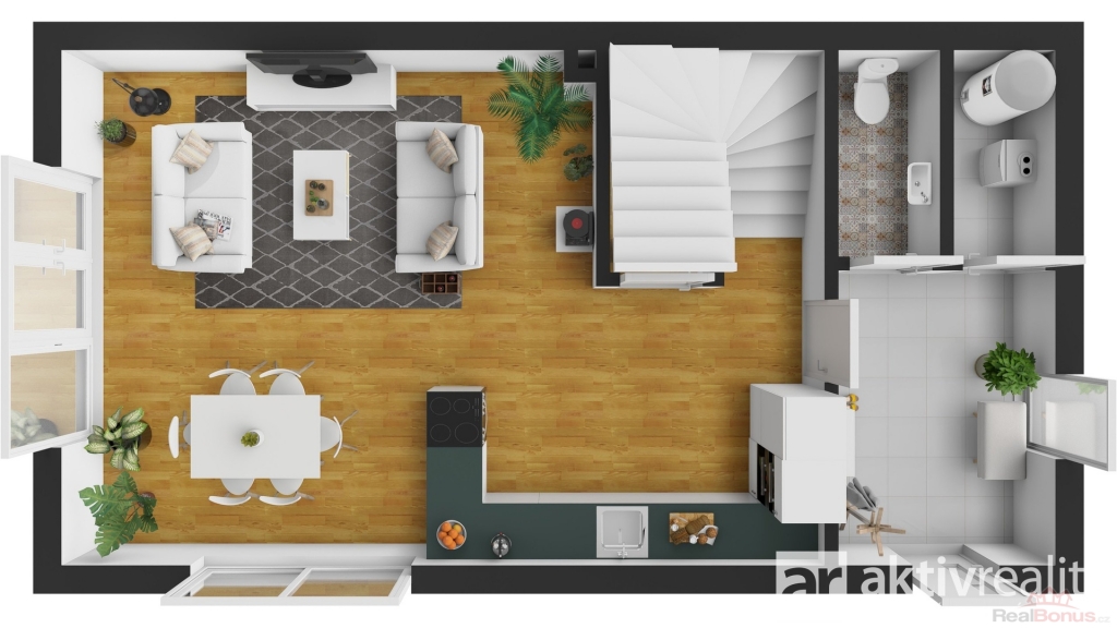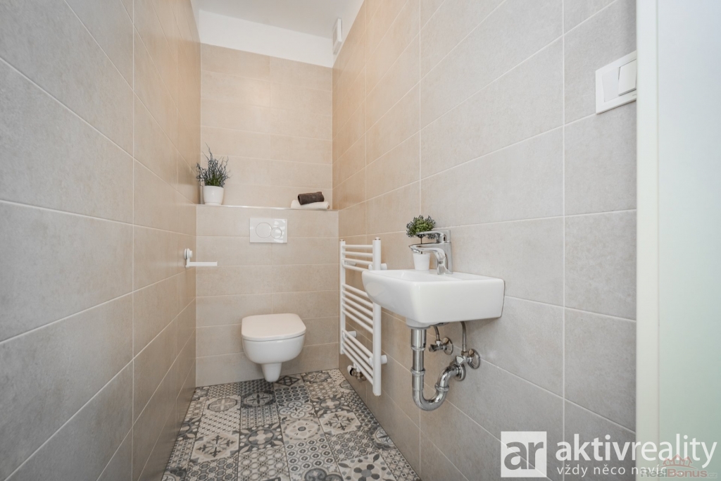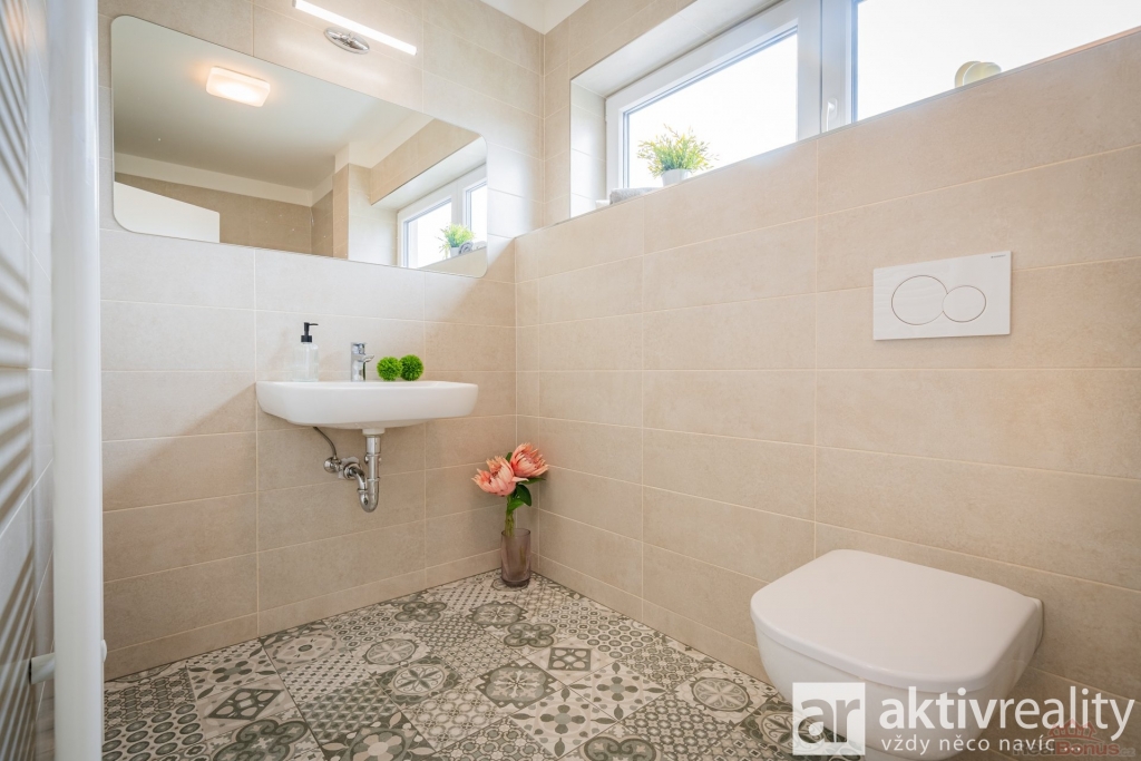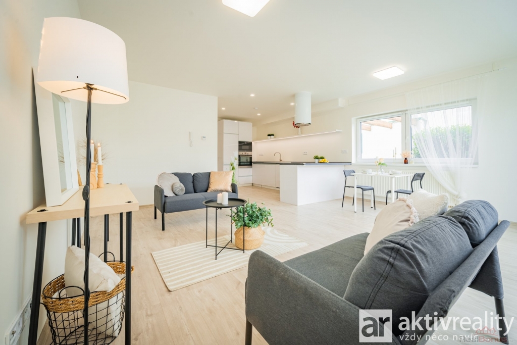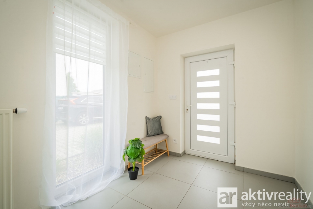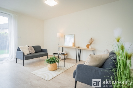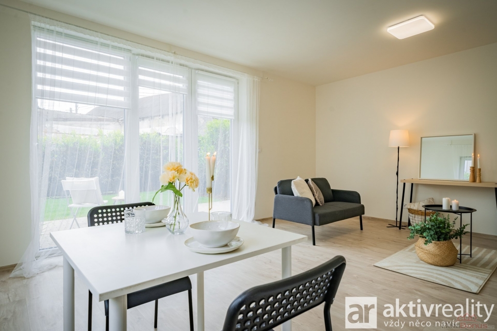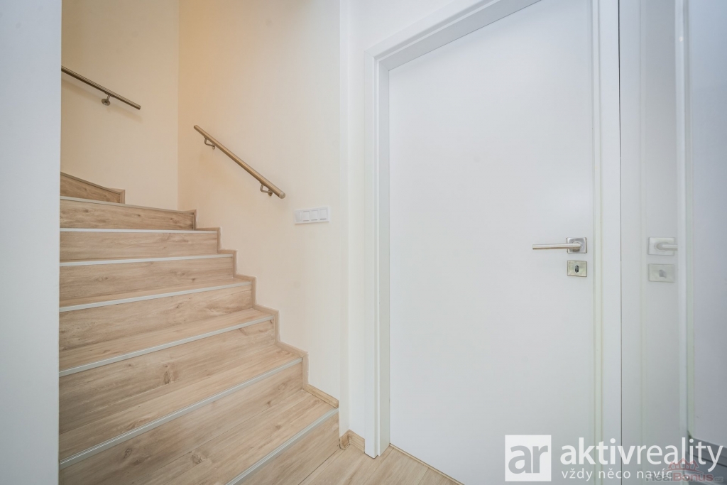 V přízemí Vás přivítá prostorné zádveří s místem na šatní skříň a botník, dále také samostatná toaleta s umyvadlem a také technická místnost s kondenzačním kotlem a centrální filtrací se změkčovačem vody pro celý dům. Navazující chodba ústí do vzdušného obývacího pokoje s kuchyní (34,5 m2), odkud francouzské dveře vedou na terasu a do zahrady. Kuchyně byla zhotovena na míru a nabízí kompletní vybavení - lednička, mrazák, myčka, vestavěná mikrovlnná trouba, odsavač par a indukční deska na varném ostrůvku. Vše moderně navazuje na jídelní prostor, umístěný pod oknem do zahrady a volně přecházející do obývacího pokoje. V těsném sousedství kuchyně se nachází praktická spíž (3,7 m2). Přízemí doplňuje technická místnost pro pračku a sušičku.