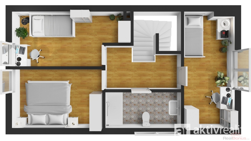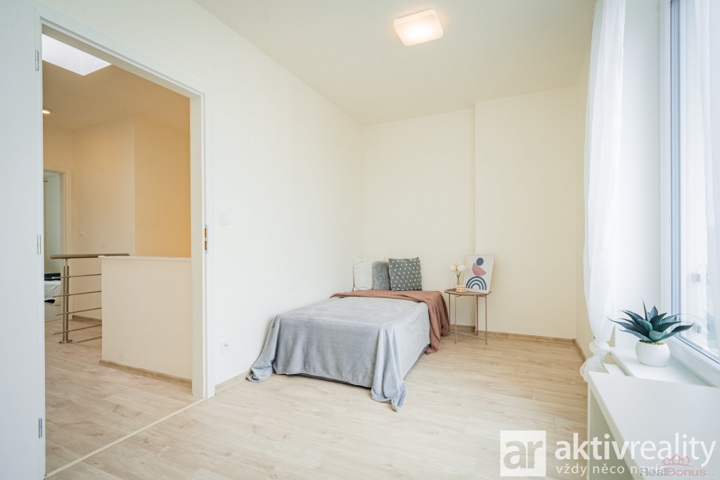 Schodištěm se dostanete do prvního nadzemního podlaží, kde se otevírá centrální chodba s praktickým velkým světlíkem, který dodává celému prostoru příjemný přísun denního světla. Ložnice rodičů a dva dětské pokoje, poskytují soukromí i dostatek prostoru. Patro uzavírá koupelna s vanou a druhou toaletou.