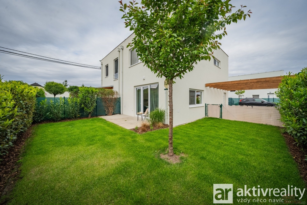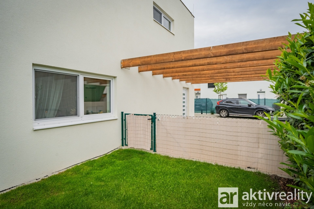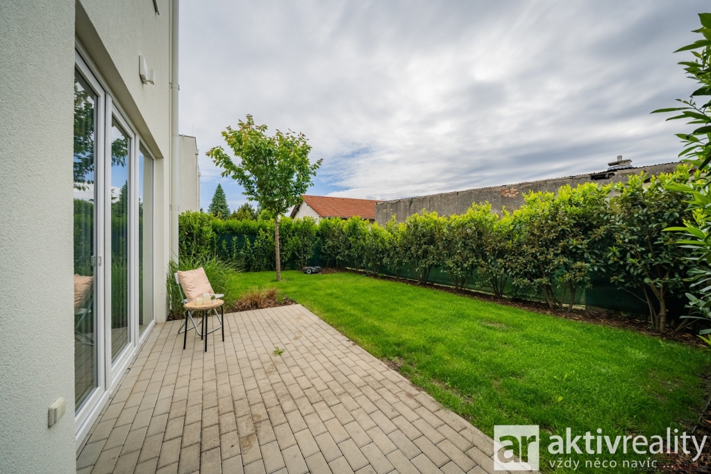 Pozemek je zcela zatravněn, vybaven automatickou závlahou napojenou na vlastní studnu, která je určena pouze na závlahu a užitkovou vodu, péči o trávník doplňuje automatická sekačka. Zahrada je poté od sousedních domů oddělena živým plotem o výšce 150?180 cm. Terasa 3 × 3 m navazuje na obývací pokoj, takže grilování i ranní káva se přesouvají přímo do zeleně. Parkování řeší kryté stání a druhé venkovní místo ze zámkové dlažby, vnitřní komunikace v areálu je soukromá a osvětlená. Přístupná je jen jednou bránou pouze pro 6 rodin žijících v tomto areálu.