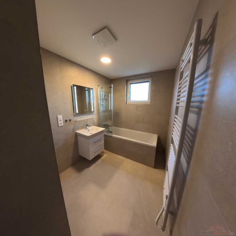 Samotný byt nabízí vstupní chodbu, kde je dále vstup do ložnice, dětského pokoje, kuchyně s obývacím pokojem, koupelny s vanou a oddělené WC. Z obývacího pokoje s kuchyňským koutem je vstup na balkón 5,3 m2. Kuchyňská linka je kompletně vybavena varnou deskou, troubou, digestoří, myčkou a vestavěnou lednicí. V chodbě je pračka a sušička ve vestavěné skříni. Do bytu je zavedena pozemní TV anténa, připraveny jsou rozvody pro internet. Byt je vhodný pro nekuřáky a bez domácích mazlíčků.