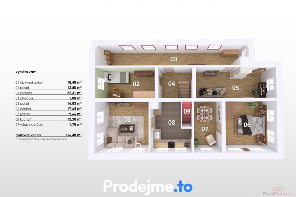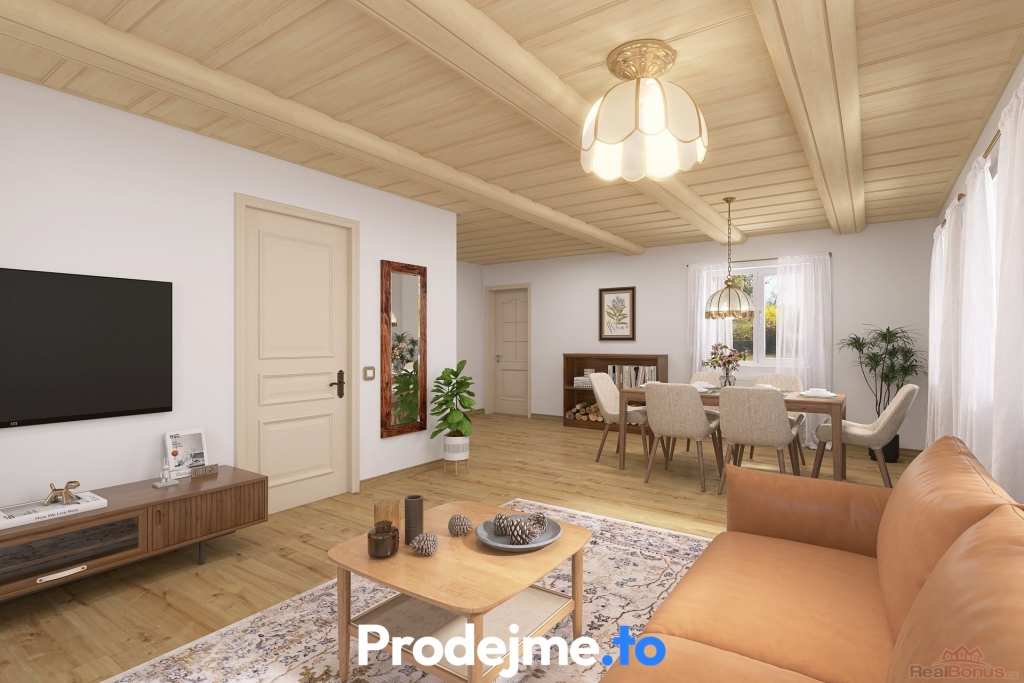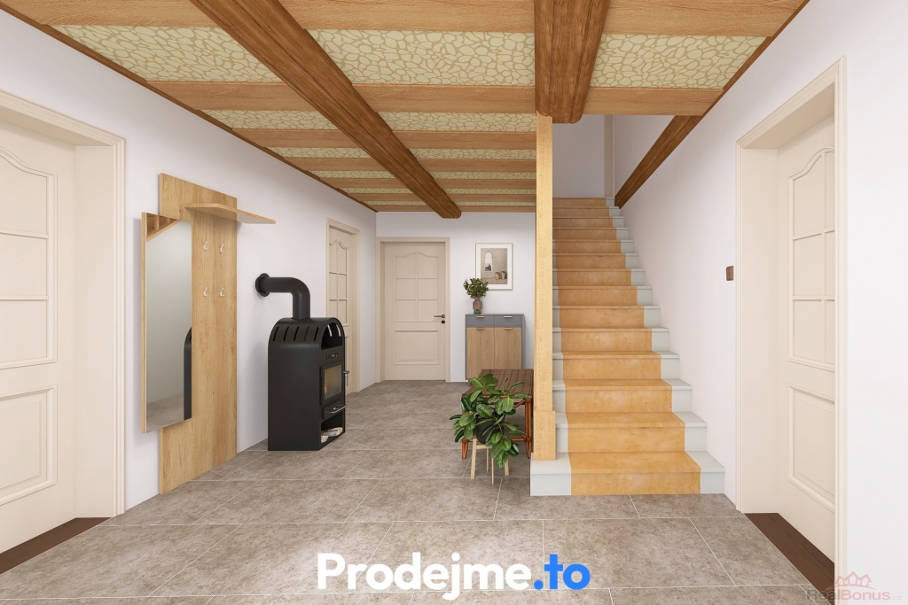 Přízemí sestává ze 2 kuchyní, obývacího pokoje s jídelnou, ložnice, pokoje, koupelny, toalety a komory. Patro disponuje obývacím pokojem, kuchyní, ložnicí, jídelnou, 2 pokoji, komorou a vstupem na půdu. Půda nabízí velký otevřený prostor, který může v případě rekonstrukce posloužit k vybudování dalších podkrovních místností. Dům je podsklepený a nabízí sklep o celkové ploše 32,36 m2. Pro dokonalou představu o dispozičním řešení a uspořádání místností si prosím prohlédněte půdorysy, které jsou součástí inzerátu. Na dům přímo navazuje také dvorek s prostornou stodolou.