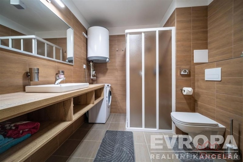 Byt se nachází v přízemí viladomu, kolaudovaného v roce 2021, na krásném místě v areálu Riviera Lipno, v blízkosti lipenské pláže a docházkové vzdálenosti od turistického centra Lipna nad Vltavou a promenády s restauracemi, kavárnami a obchody. Apartmán se skládá ze vstupní předsíně, prostorného obývacího pokoje, který je rozdělen na jídelní část s kuch. Linkou a část obývací, součástí prodeje je vybavení apartmánu, manželská postel a pohovka, která může po rozložení sloužit jako další 2 lůžka. Navazující kuchyně s barem a barovým sezením je vybavena vším pro pohodlné vaření a stolování. Spotřebiče (lednice s mrazákem, myčka, el. trouba, sklokeramická varná deska, kávovar na kapsle). Ve vstupní hale je umístěna prostorná šatní skříň a nabízí dostatek úložného prostoru. Obrovskou výhodou je výstup na venkovní terasu 16,5m2, která nabízí posezení venku a pěší vzdálenost od Lipenské přehrady. Koupelna se sprchovým koutem, toaletou a pračkou. Součástí je také vlastní sklep pro uskladnění jízdních kol, lyží, kočárků a vlastní venkovní parkování, na privátním parkovišti před apartmánem.