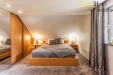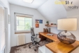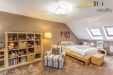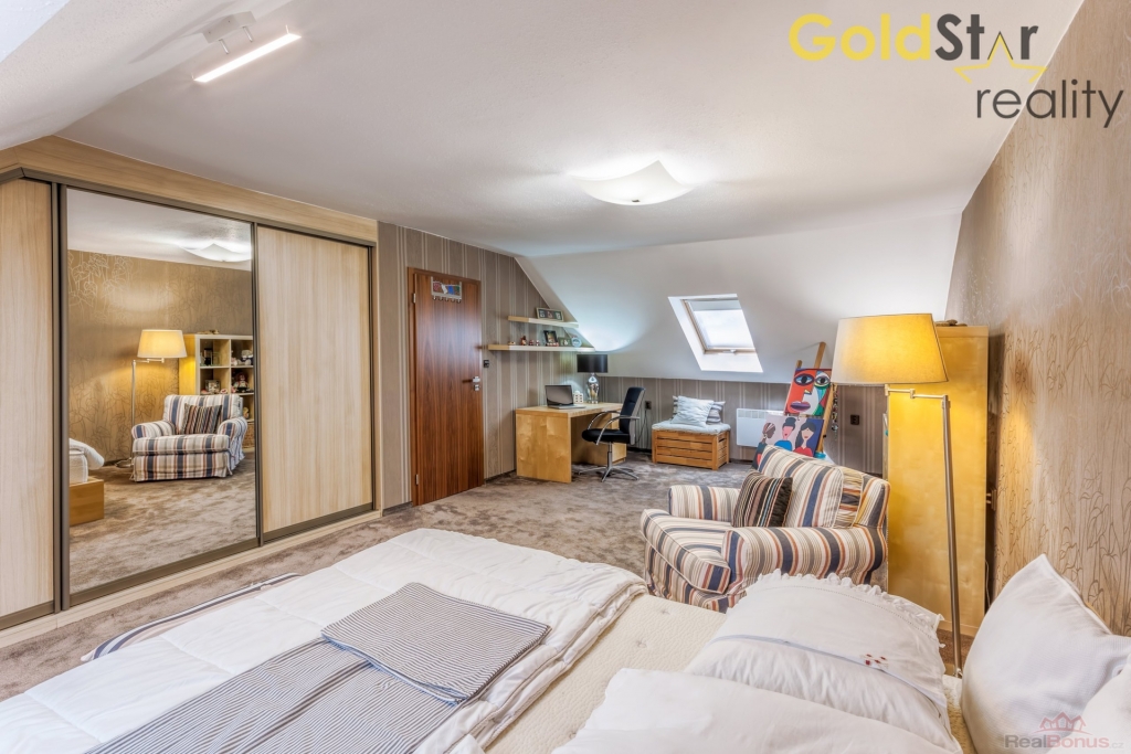 Na patře najdete ložnici (12 m2), velký podkrovní pokoj (31 m2), který je možno rozdělit na dva menší pokoje, pracovnu otevřenou do prostoru schodiště (7 m2), balkon a koupelnu se sprchovým koutem, toaletou a bidetem. Dům má menší sklep s technickým zázemím pro pračku a sušičku, přístupný z verandy, odkud se vychází také na zahradu.