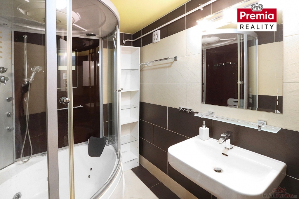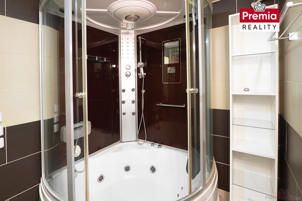Ze vstupní chodby se vchází do šatní místnosti, obývacího pokoje, samostatného WC, koupelny s masážním boxem (hydromasážní krytá vana) a plynovým kotlem.
