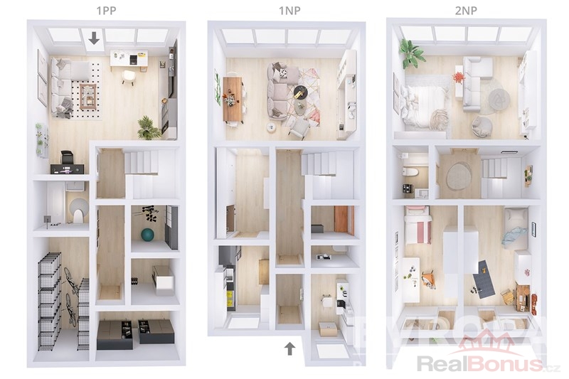 V přízemí domu se nachází skladové a technické místnosti, toaleta a obývací pokoj se vstupem na zahradu. V prvním podlaží domu se nachází šatní místnost, toaleta komora, kuchyň a obývací pokoj. Ve druhém podlaží domu se nachází 2 ložnice se vstupem na balkon, hlavní ložnice s výhledem do zahrady a toaleta.