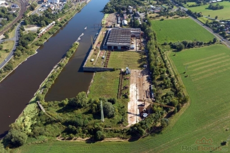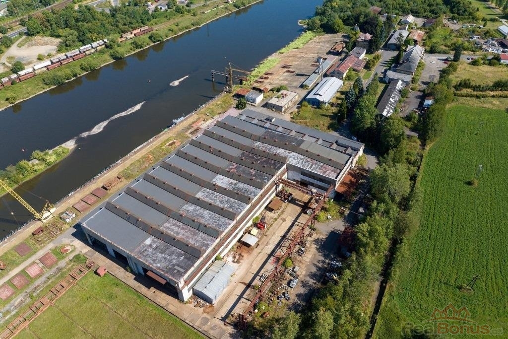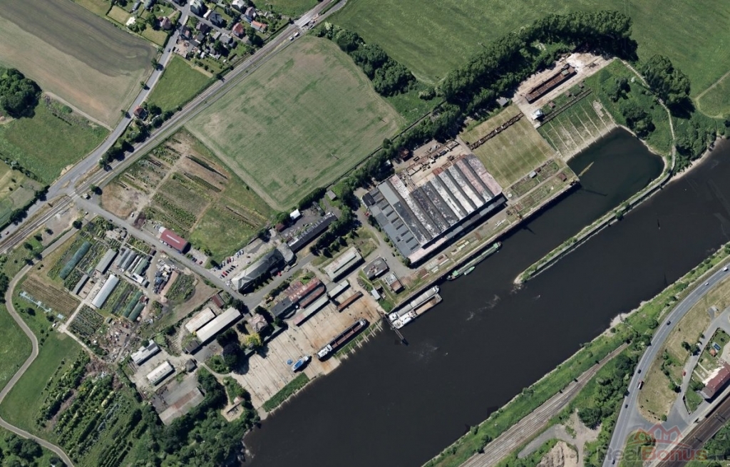 Prodej rozsáhlého areálu se zázemím pro výrobu (stavbu) a opravu lodí, podlahová plocha 12.815 m2, celková výměra pozemků areálu 102.614 m2, Křešice - Děčín