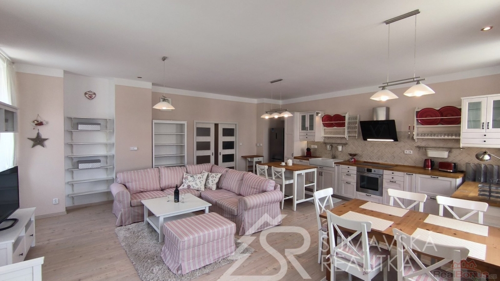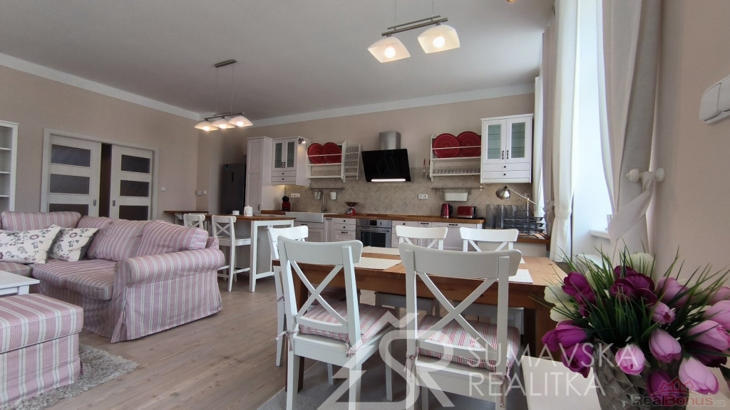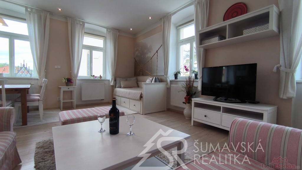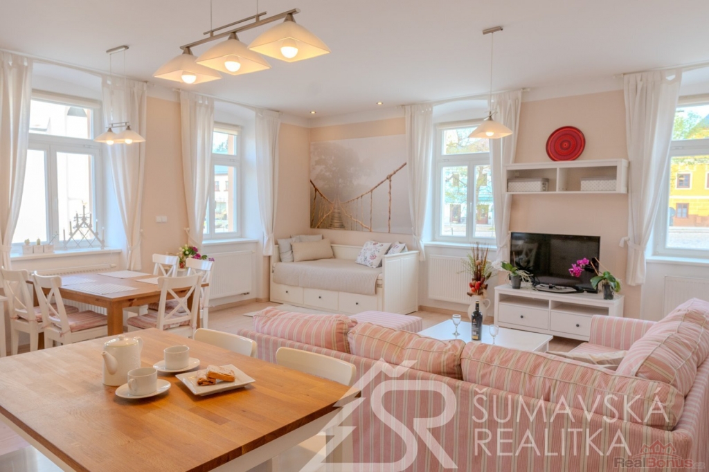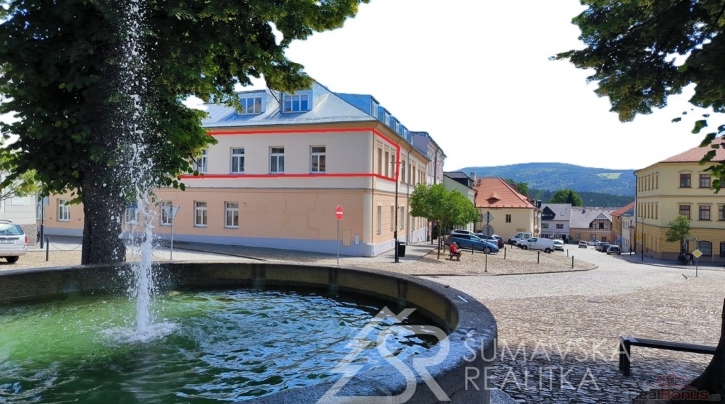 REZERVOVÁNO. Lokalita: apart.dům má dobrou adresu na Šumavě-malebné horské středisko Kašper.Hory 758 m n.m. Siluetu okolních hor završuje nejvýše položený hrad v Čechách-středověký Kašperk založený k ostraze zemské hranice a Zlaté stezky. Nabízený apartmán má výhled na malebné náměstí s renovovanými historickými domy,kašnou,gotickým kostelem a radnicí,která by mohla být kulisou do pohádky. Předností města je perfektní vybavenost (hotely,restaurace,obchody,škola,školka lékařský dům,kino,muzea,knihovna). Na okraji města směrem k Amáliinu údolí je moderní SKIAREÁL, vybavený večerním osvětlením sjezdovek a lyžařskou školou s půjčovnou. Šumavský národní park nabízí výlety na mnoho krásných míst dostupných na elektrokolech nebo pěší turistikou a v zimě upravené trasy pro běžky. Kašperské Hory jsou jedním z hlavních šumavských horských center nabízejících svým návštěvníkům po celý rok příjemně strávený čas s nabídkou kvalitních služeb. Váže se k nim tvorba významného šumavského autora Karla Klostermanna. Spisovatelův otec zde působil jako lékař, několik let byl starostou a bydlel v domě, kde se nachází nabízený apartmán. Popis domu: krásná poloha přímo na historickém náměstí v původním měšťanském domě z masivního zdiva (cihla a kámen) zajišťující perfektní tepelnou pohodu v letním i zimním období. V roce 2013 byl zkolaudován po náročné rekonstrukci na bytový dům, kde ve třech nadzemních podlažích se nachází 20 bytů. Výhodou je prostorné a pohodlné schodiště, společné podsklepení kam je přiveden centrální zdroj městského vytápění na biomasu. Popis bytu: nabízený krásný, vzdušný, perfektně prosvětlený atypický apartmán 3+kk o vým. 90,19 m se nachází v prvním patře bytového domu. Jedná se o málo a velmi šetrně užívaný rohový byt v osobním vlastnictví. Oproti bytům v nové výstavbě nabízí velkorysý prostor a jedinečnou atmosféru. Velkorysý obývací pokoj propojený s plně vybavenou kuchyní má pěti velkými okny nádherný výhled na gotický kostel a kašnu na pozadí renovovaných historických domů. Komfort zajišťují i dvě ložnice, prostorná koupelna se sprchou a WC a další samost.WC. Všechny místnosti jsou propojeny širokými posuvnými dveřmi do pouzder stylově i barevně sladěnými s plovoucí podlahou a mimořádně bohatým vybavením jednotným bílým nábytkem viz fotogalerie, vše v ceně. Výhodou jsou dvě komory na chodbě přímo u bytu, které poskytují dostatek úložného prostoru. Atraktivitu této nabídky zvyšuje garáž o vým.16,8 m2 v perf.upraveném nádvoří domu s pohodlným vjezdem posuv.vraty rovněž zahrnuta v ceně. Tato nabídka je dobrou volbou pro ty, kdo hledají investici do nemovitosti nebo klidné místo pro rekreaci i bydlení s pohodlným přístupem k veškeré vybavenosti v horském středisku na Šumavě. Apartmán je vytápěn centrálně z městské výtopny na biomasu, což zajišťuje nízké náklady na energie a ekologický přístup. Jako alternativa pro operativní přitopení mimo topnou sezonu je v apartmánu nainstalován i elektrokotel jako náhradní zdroj tepla.
