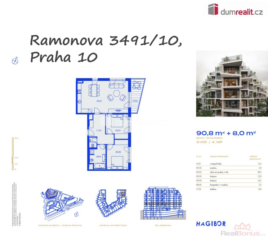 služby 6900 Kč + elektroměr, Dumrealit.cz Vám zprostředkuje exkluzivně pronájem nového, designového, plně zařízeného bytu 3+kk (90,8 m) s balkonem 8 m, sklepem (8m) a možností dopronajmutí 2 x parkovacího stání, v nízkoenergetické novostavbě (PENB B, kolaudace 2025 rezidence Hagibor s vlastní recepcí) v Praze 10 Strašnice, ulice Ramonova, pouze 2 minuty od zastávky tramvaje a 5 minut od metra A Jana Želivského. Tento byt je zcela nový, nepoužívaný, právě vy můžete být prvním nájemcem. Byt je umístěn ve 3.patře / 4 NP 10.patrové novostavby s pěkným výhledem. Kompletní designové vybavení bytu je v ceně nájmu. Dispozice tohoto bytu tvoří: prostorný obývací pokoj (38,3 m) s kuchyňským koutem, prostorem na jídelnu a pracovní kout, se vstupem přes velké balkonové okno na balkon (8 m), dále ložnice (14,2m) s postelí a velkou vestavěnou skříní, dětský pokoj (12 m), prostorná chodba (11,5m) také s vestavěnou skříní a koupelna (7,5m) s vanou, WC, pračkou a umyvadlem. Poslední místností je samostatná toaleta (1,8 m). Tento byt je v osobním vlastnictví, je v top stavu, připravený ihned k užívání. Pronajímatel garantuje stabilní, dlouhodobý pronájem. V bytě je rekuperace, na podlaze jsou dřevěné podlahy, orientace bytu je na sever / 2 okna v obývacím pokoji, ostatní okna vč. balkonu pak na východ. V 3-patře je 2 x parkovací stání, které lze obě dopronajmout, nebo pouze jedno z nich k bytu a samostatný sklep (8 m - je v ceně nájmu). V přízemí domu je pak 24h recepce a menší park ve vnitrobloku. Služby jsou plně vyúčtovatelné, elektroměr se převede na nájemníka. Velmi doporučuji všem, kteří hledají nový, plně vybavený byt designovým nábytkem a vybavením, přípravný ihned k užívání, s možností parkování, sklepem a maximální občanskou vybaveností. Majitel si v bytě nepřeje psa ani kočku. Projekt je umístěn na pomezí mezi Vinohrady, Strašnicemi a Malešicemi. Je nedaleko stanice metra Jana Želivského A. V okolí je absolutní klid a mnoho sportovišť - tenisové kurty, futsalové hřiště a krytá sportovní hala, v docházkové vzdálenosti je Malešický park a park Parukářka. Ev. číslo: 652092. Energetický štítek: B (66 kWh/m2/rok).