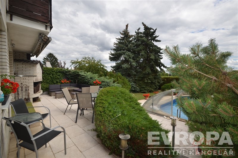 Vzrostlá zeleň v zahradě zajišťuje dostatek soukromí, milou atmosféru dotváří venkovní krb, maximum komfortu potom vyhřívaný bazén se zastřešením.