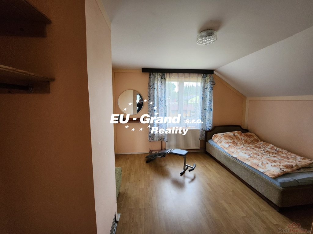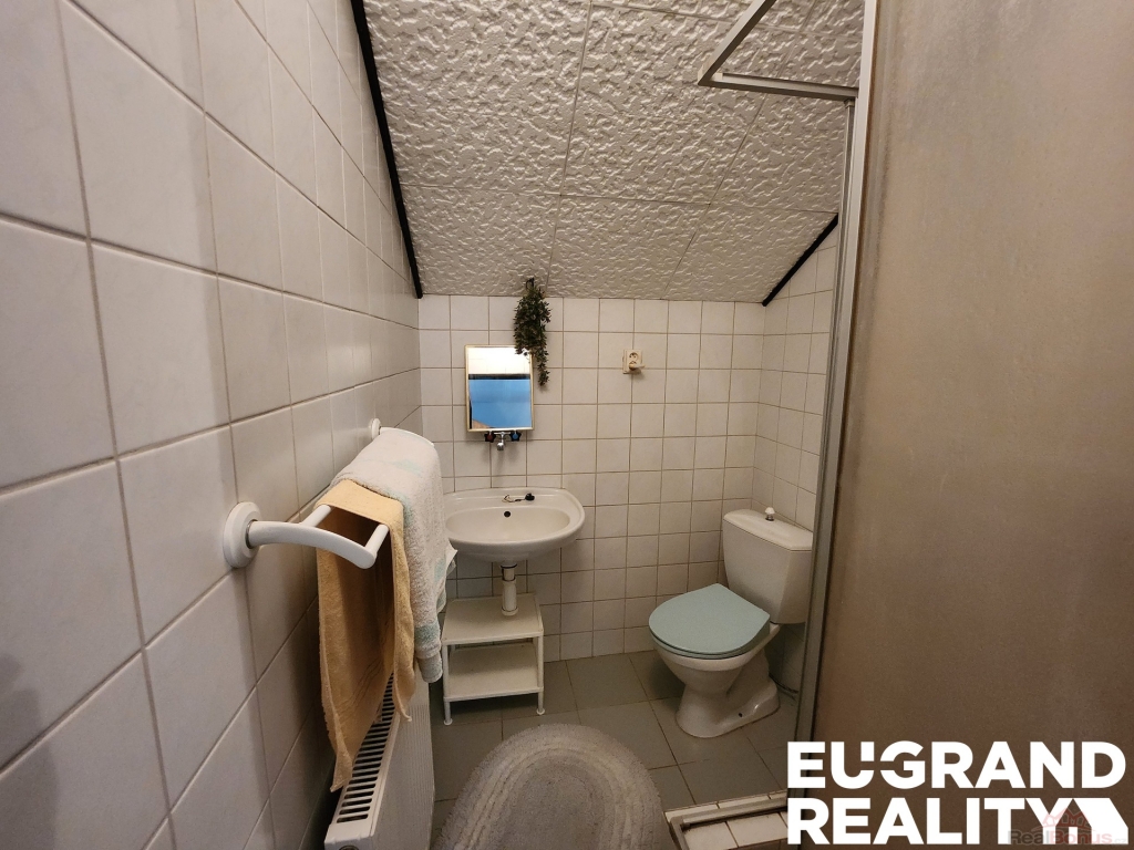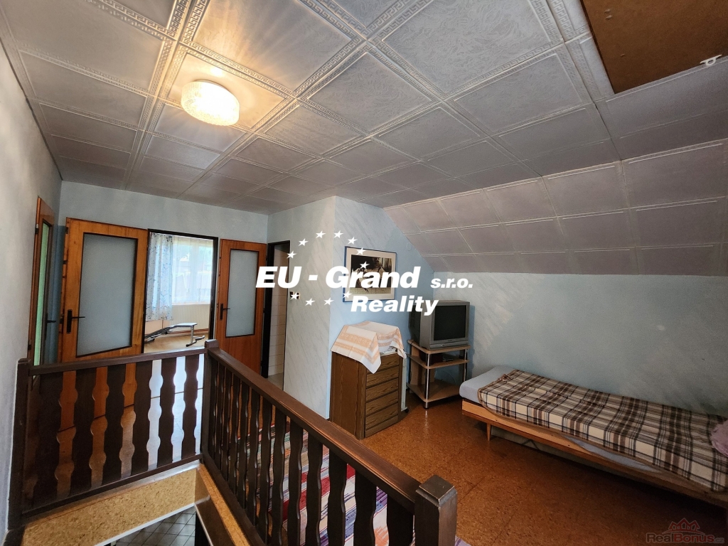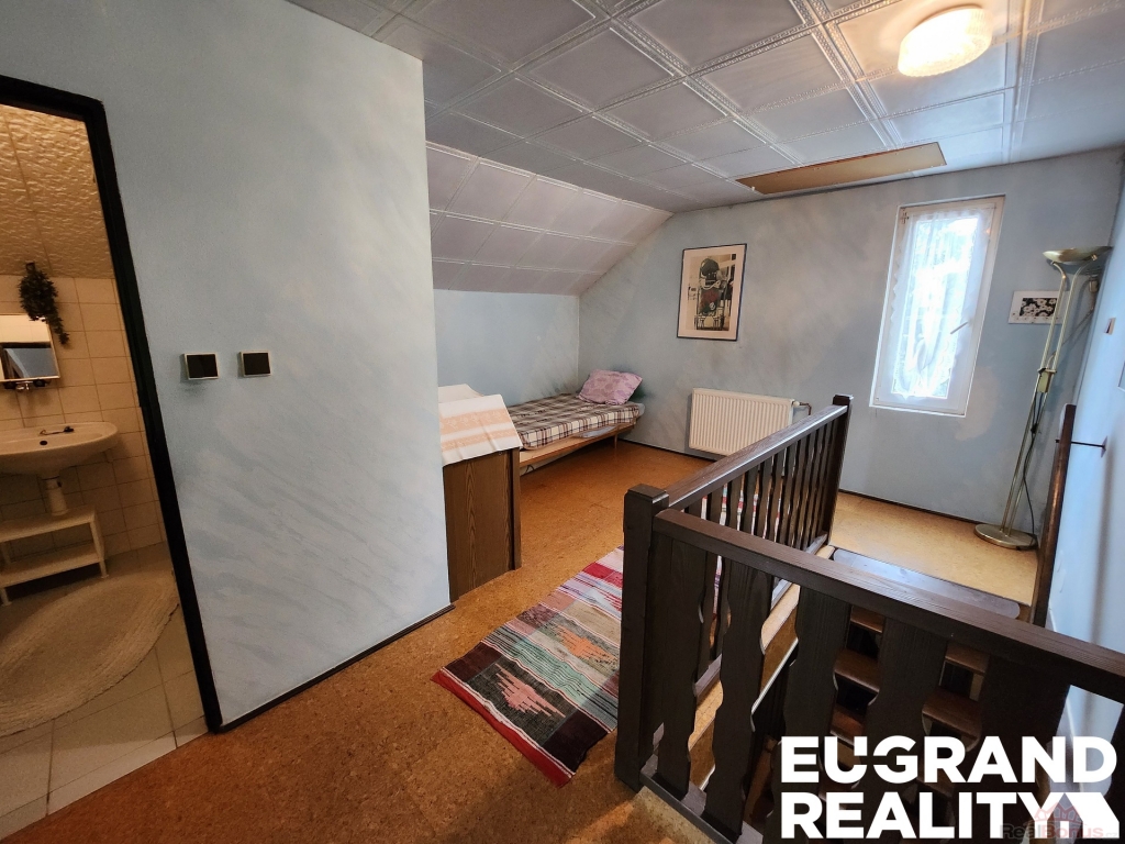 ? V patře je větší chodba, koupelna se sprchovým koutem a WC, ložnice a dětský pokoj.
