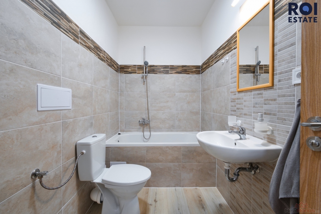 Dispozice bytu je jednoduchá a funkční ? prostorný obývací pokoj s kuchyňským koutem, ložnice se šatní skříní a koupelna s vanou. Kuchyň je vybavena sporákem, varnou deskou a lednicí, takže se můžete rovnou nastěhovat a začít bydlet bez zbytečných investic.
