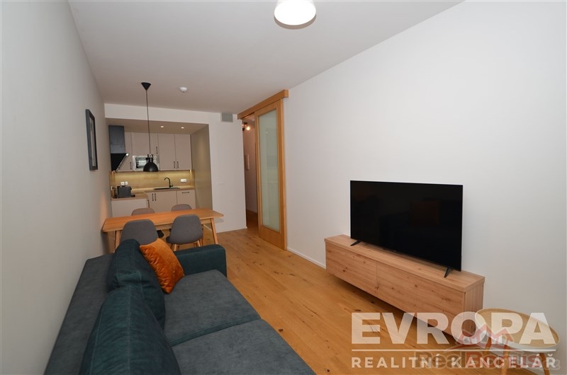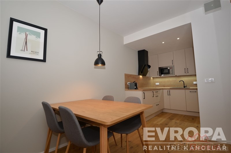 Dispozice apartmánu 2+kk s celkovou výměrou 47,6m2, je umístěn v přízemí 1.NP. Skládá se z předsíně s úložnými vestavěnými skříněmi, obývacího pokoje s jídelním a kuchyňským koutem, kuchyňská linka se spotřebiči. Apartmán se nabízí na prodej včetně kompletního vybavení a zařízení viz. fotografie. Obrovskou výhodou je vlastní venkovní parkovací stání, sklep s přívodem elektřiny pro nabíjení elektrokol a vlastní skibox.