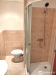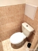 Vkusně obložená vyzděná koupelna se sprchovým koutem a umyvadlem je spojena s toaletou.