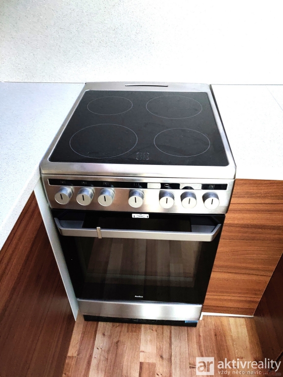 Kuchyňská linka je vybavena elektrickým sporákem se sklokeramickou deskou, zabudovanou pračkou, k dispozici je lednice.