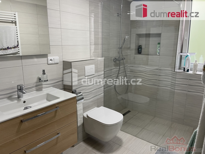 Vybavením koupelny je pračka, sušička, umyvadlo, zrcadlo, sprchovací kout, WC a otopný žebřík.