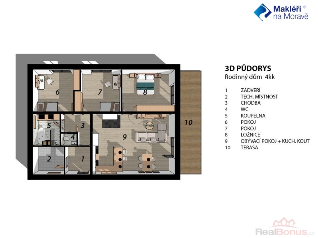 Jestli toužíte po bydlení ve svém, přijeďte se podívat na novostavbu sympatického bungalovu o dispozici 4+kk v podhorské obci Návsí u Jablunkova. Dům je řešen velmi účelně s pohodlným jednoduchým prostorovým interiérem s užitnou plochou 128 m2. Všechny místnosti jsou dostatečně velké, aby sloužily jak společnému trávení času v dominantním obývacím pokoji, tak také k soukromí každého člena rodiny. Každý pokoj má svůj východ francouzským oknem do zahrady. V prostorné koupelně je místo pro vanu, sprchový kout i 2 umyvadla. WC je řešeno samostatně. S místem pro pračku a sušičku se počítá v technické místnosti.