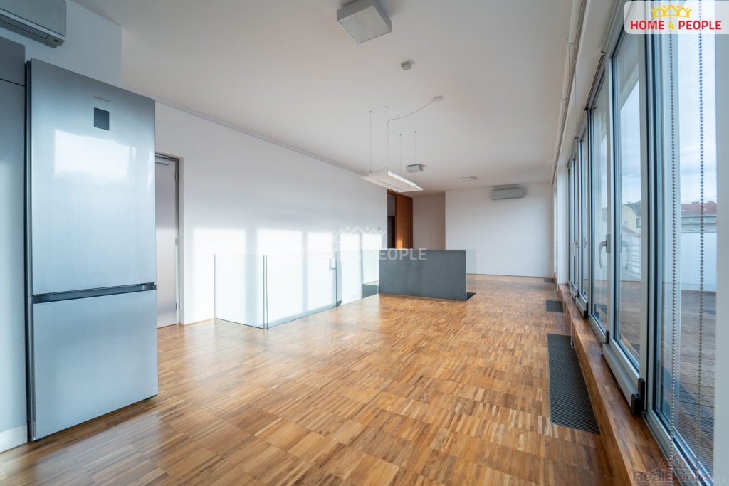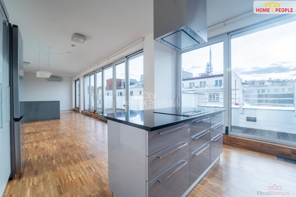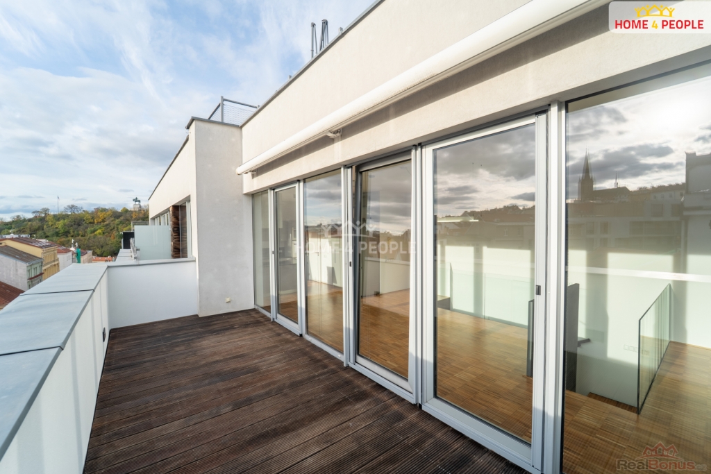 Prodej přímý majitel - Kupující neplatí provizi, Nabízíme k prodeji výjimečný mezonetový byt 4+kk o podlahové ploše 139 m, nacházející se v 6. a 7. nadzemním podlaží prestižní Rezidence Prokopova. K bytu náleží rozsáhlé venkovní plochy terasy a balkony o celkové výměře 97 m, včetně exkluzivní střešní terasy 59 m v 8. NP s dechberoucím panoramatickým výhledem na celou Prahu a Pražský hrad.