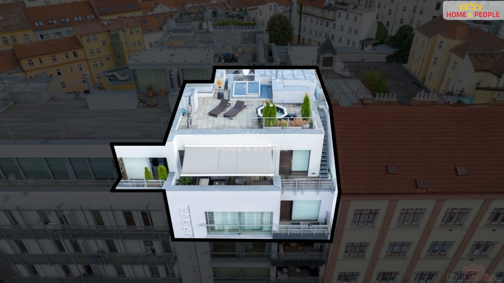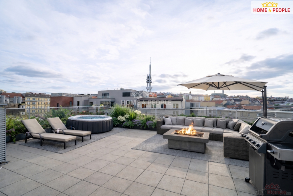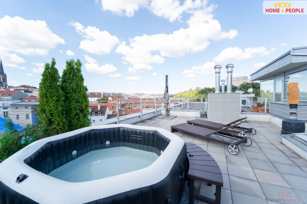 Prodej přímo od majitele, Nabízíme k prodeji výjimečný mezonetový byt 4+kk o podlahové ploše 139 m, nacházející se v 6. a 7. nadzemním podlaží prestižní Rezidence Prokopova. K bytu náleží rozsáhlé venkovní plochy terasy a balkony o celkové výměře 97 m, včetně exkluzivní střešní terasy 59 m v 8. NP s dechberoucím panoramatickým výhledem na celou Prahu a Pražský hrad.