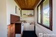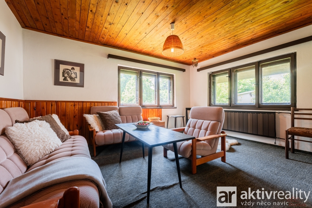 Chata je částečně podsklepená, s garáží, technickou místností a sklepem. Po vstupu do chaty se dostáváme do chodby, kuchyně a malé koupelny s WC. Dále je zde obývací pokoj a po menším schodišti se dostaneme do ložnice s balkónem. V podkroví se nabízí možnost vybudovat další dva pokoje.