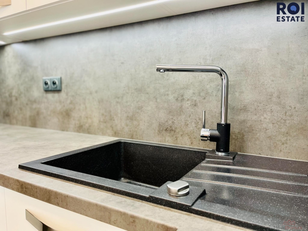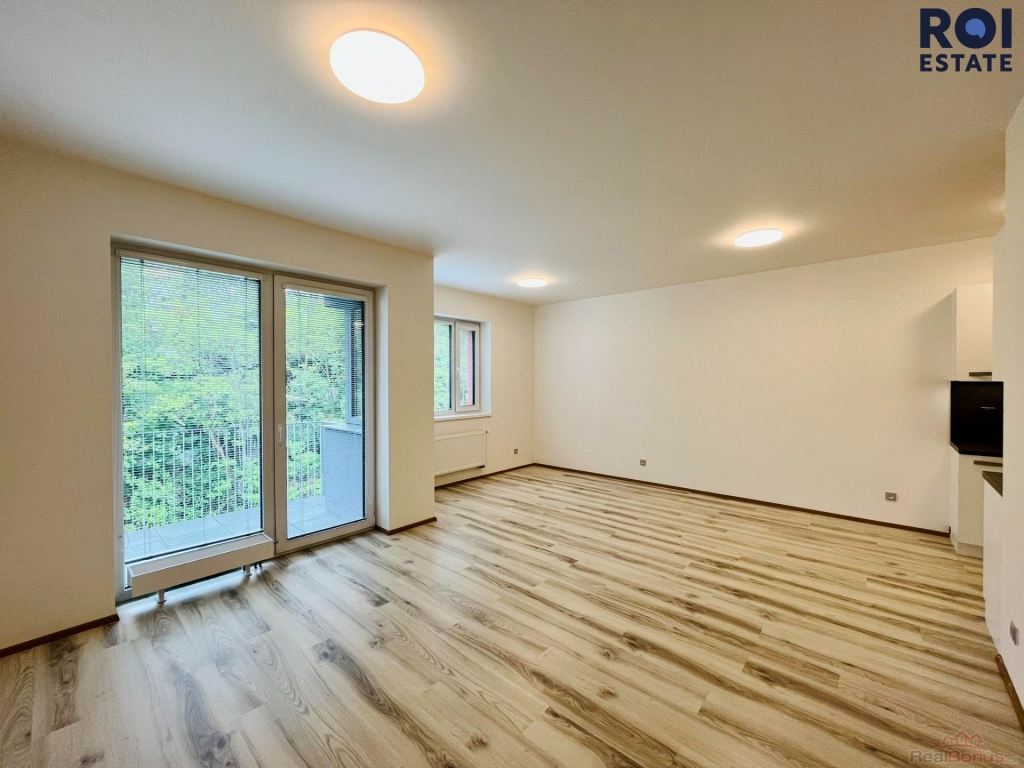 Při vstupu do bytu se ocitnete v menší předsíni, kde je stále prostor na botník či menší šatní skříň. Před námi se objeví dvoje dveře, jedny nás provedou do pokoje s kuchyňským koutem, který je nevybavený, tudíž si vše můžete zařídit dle Vaší chuti a představ. Fantazii se tedy meze skutečně nekladou! Jediné, co tu na Vás čeká je kuchyňská linka včetně indukční desky, trouby a skutečně velké pracovní plochy, jelikož bylo z prostoru pro kuchyň vytěženo maximum. Prostor je velmi vzdušný a tak se Vám sem vleze skutečně vše, co potřebujete. Velkou přidanou hodnotou je také prostorný balkon, na kterém můžete odpočívat po náročném dnu a jediné co uslyšíte, je příroda.