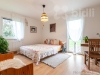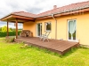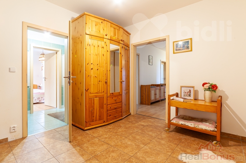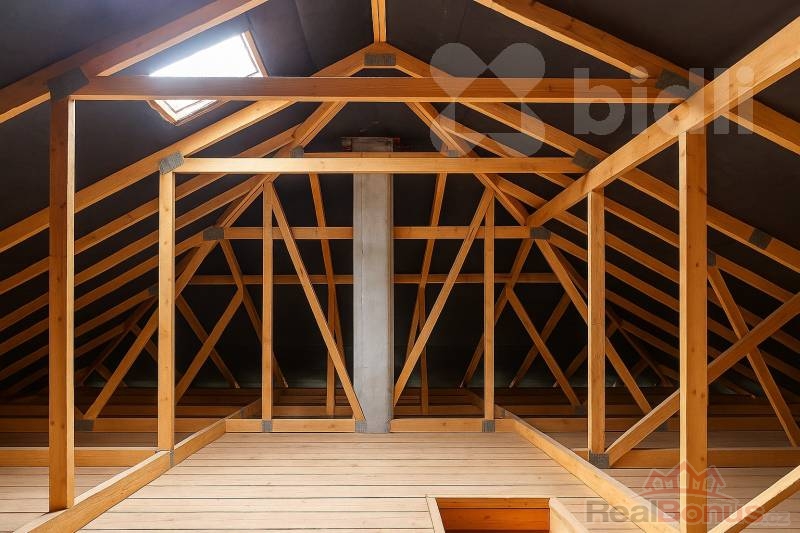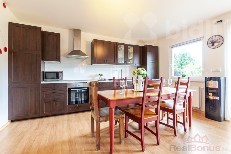 Uvnitř domu naleznete 3 samostatné pokoje, velký obývací pokoj (38 m2) s příjemnými krbovými kamny, jídelním stolem a kuchyňskou linkou v přírodních tónech vybavenou všemi spotřebiči. Z tohoto pokoje, stejně jako z ložnice rodičů, je průchod balkonovými dveřmi na jihozápadně orientovanou terasu.