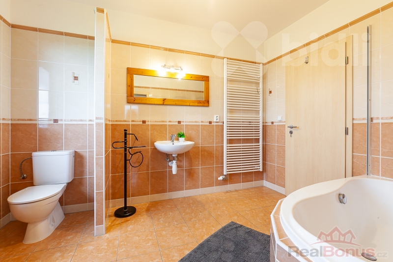 V domě jsou dvě koupelny. Koupelna se sprchovým koutem a toaletou navazuje na pokoj rodičů, druhá prostorná koupelna s velkou rohovou vanou a druhou toaletou je u dalších dvou pokojů. Dále je v domě technická místnost a nad celým domem podkroví, vhodné pro ukládání sezónních věcí.