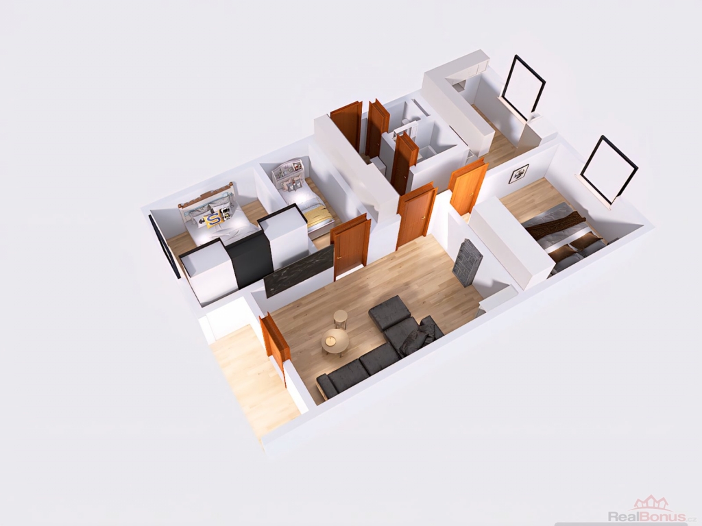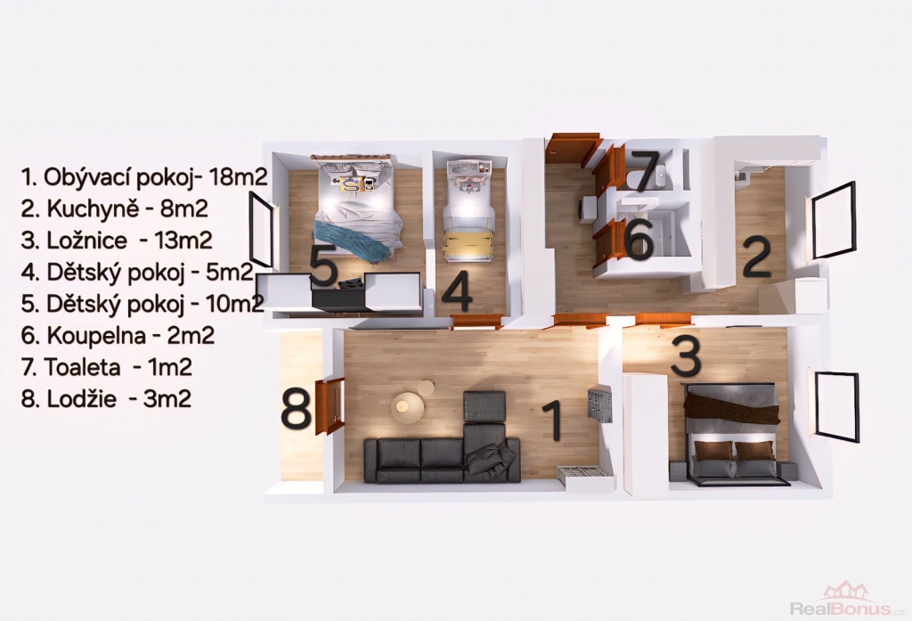 Dispozice bytu je velmi praktická. Najdete zde prostorný obývací pokoj, kuchyň s jídelní částí, ložnici a dva samostatné pokoje. K dispozici je také koupelna, samostatná toaleta a lodžie.