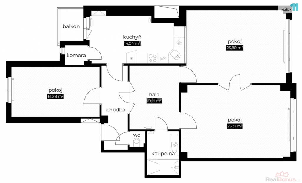 koupelnou se sprchovým koutem, samostatným WC o celkové ploše 105 m. Kuchyně