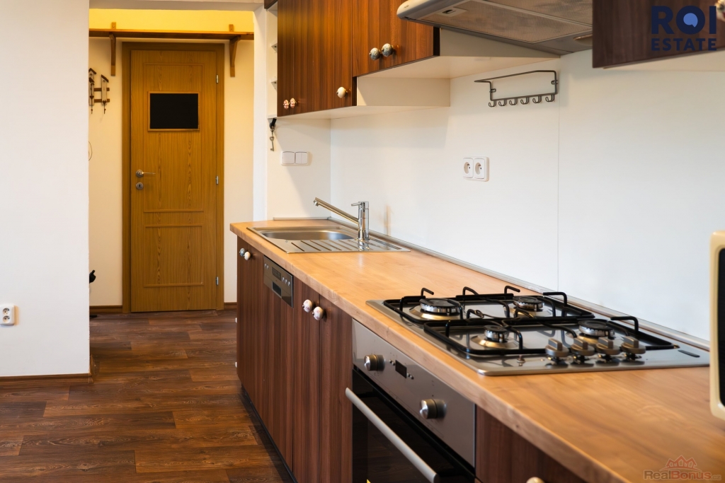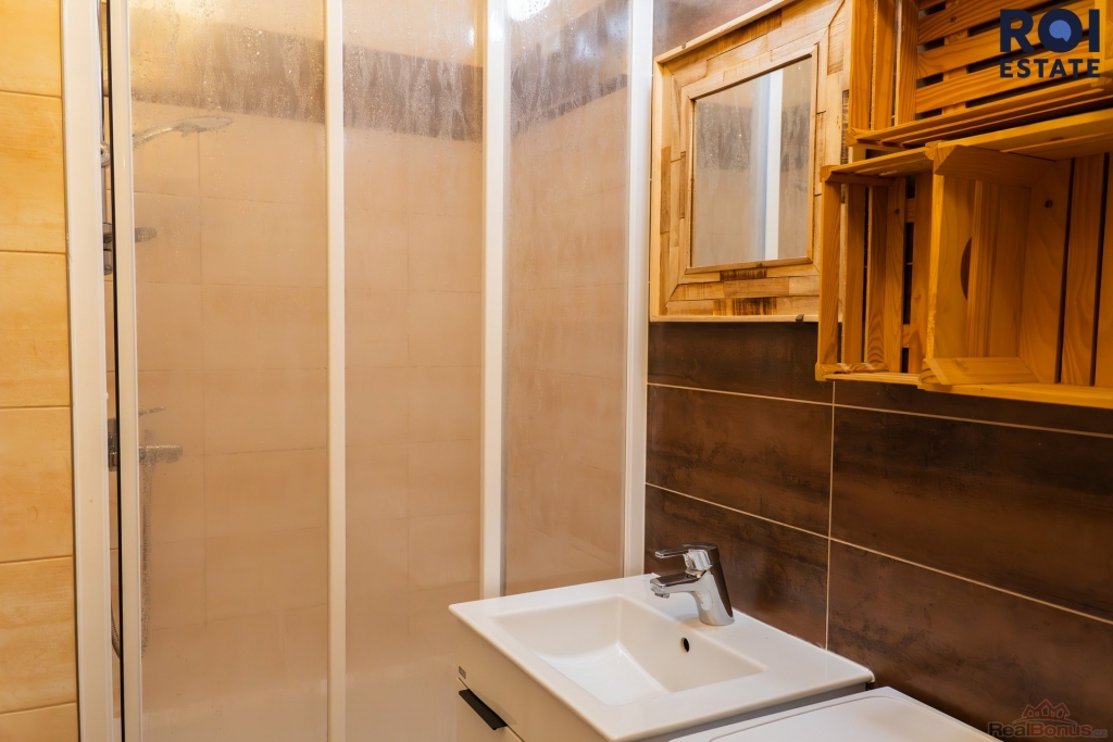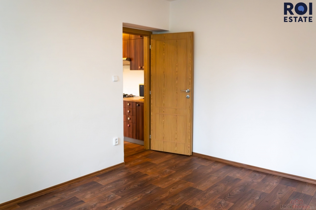 Po vstupu vás přivítá malá předsíň, odkud vejdete do koupelny se sprchovým koutem, toaletou a pračkou. Naproti se nachází ložnice a vlevo kuchyňský kout s obývacím pokojem. Z něj vede vstup do další místnosti, vhodné jako dětský pokoj, pracovna nebo šatna.