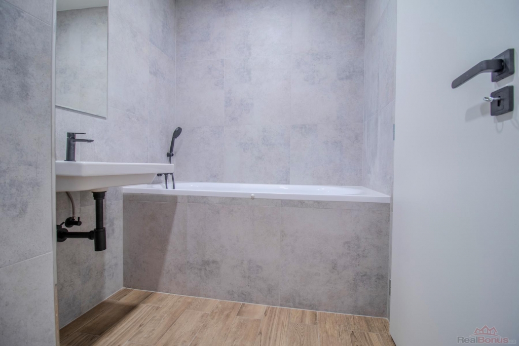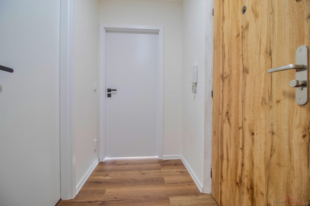 Byt je vybaven novou kuchyňskou linkou (bez spotřebičů), přičemž kuchyňská část je prakticky částečně oddělená od obytného prostoru a nechybí zde ani místo pro jídelní stůl. Díky promyšlené dispozici působí obývací pokoj velmi vzdušně a prostorně, pohodlně se sem vejde jak sedací souprava, tak postel i další úložné prvky, což z bytu dělá ideální volbu pro pohodlné a funkční bydlení. Designová koupelna je vybavená prostornou vanou, umyvadlem a toaletou. Vstupní chodba nabízí dostatek úložného prostoru.