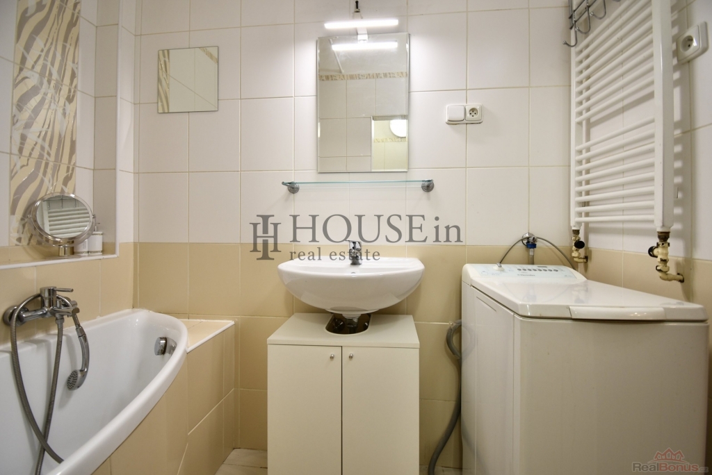 Byt sestává z prostorné předsíně s dostatkem úložného prostoru (šatní skříň, botník), obývacího pokoje s jídelním a kuchyňským koutem (kuchyňská linka, plynový sporák s troubou, lednice s mrazákem, jídelní stůl se židlemi, komoda, ložnice vybavené nábytkem (šatní skříň, komoda, konferenční stolek, 2 křesla, sedačka ? je potřeba doplnit postel), a koupelny s rohovou vanou, toaletou, umyvadlem a pračkou.