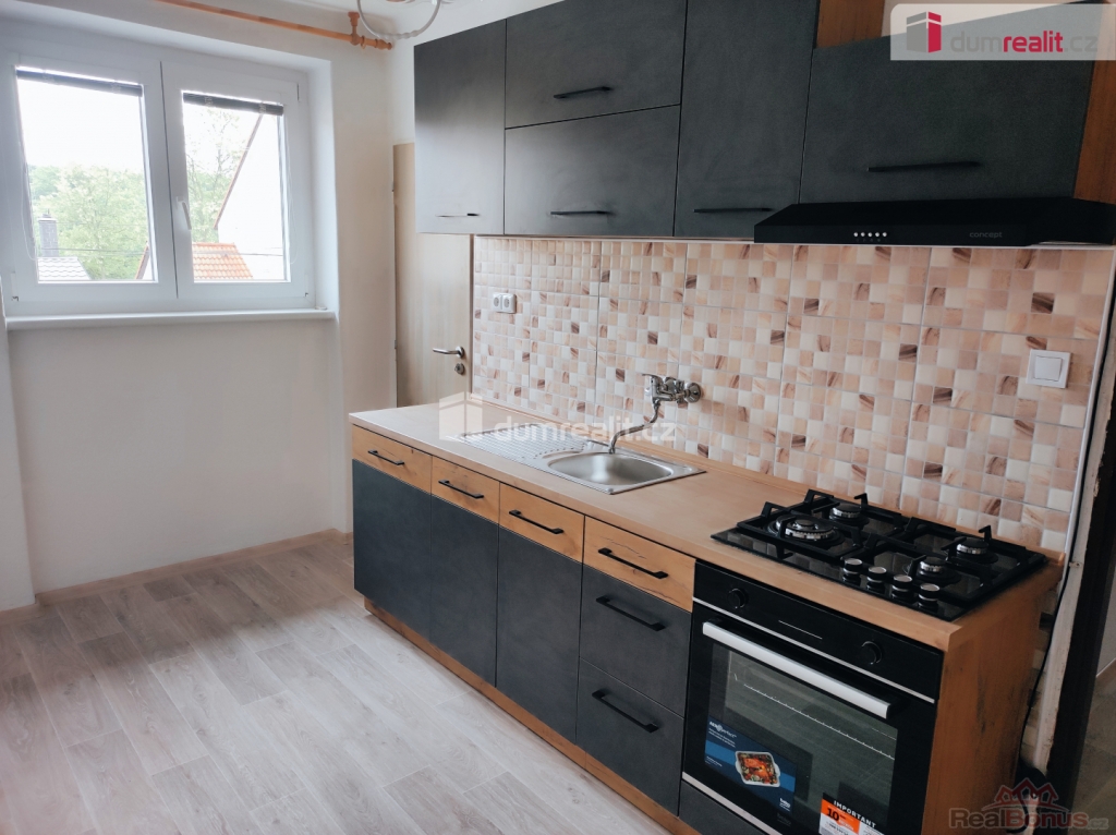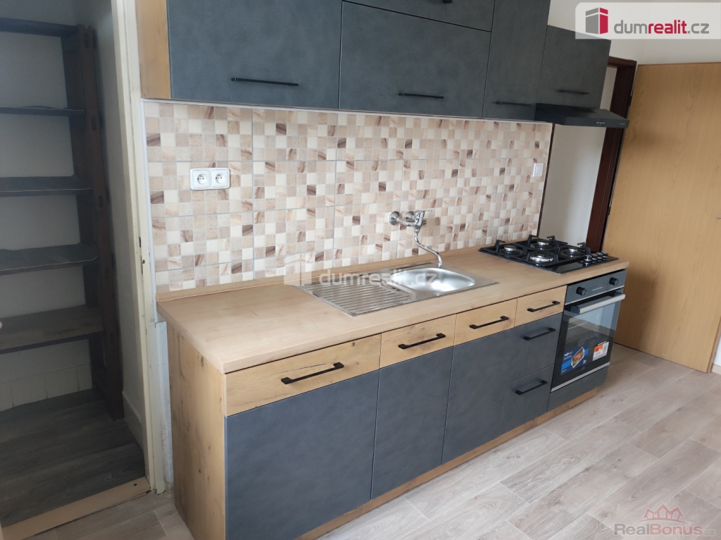 Kuchyňská linka je s plynovým sporákem a elektrickou troubou úplně nová, stejně tak jako celý byt, který je po kompletní rekonstrukci. V kuchyni je malá místnost použitelná jako špajz.