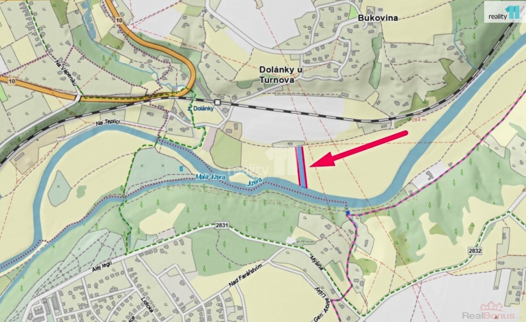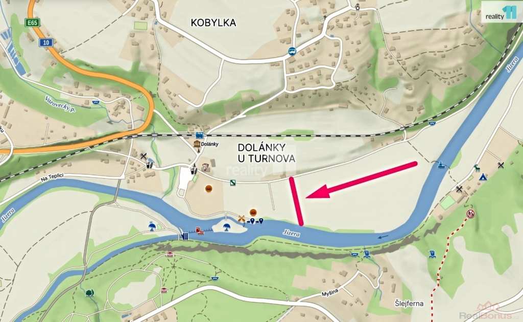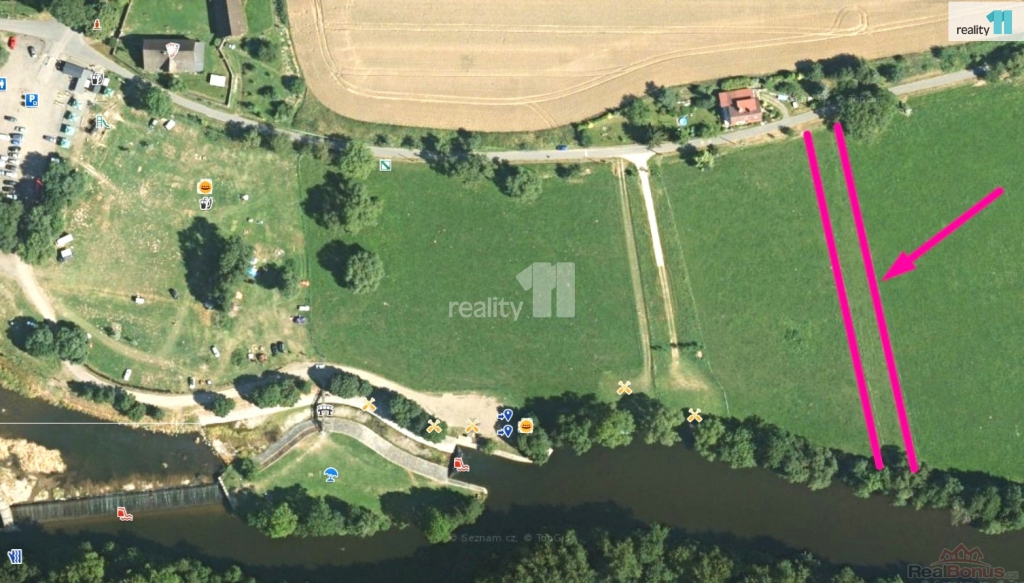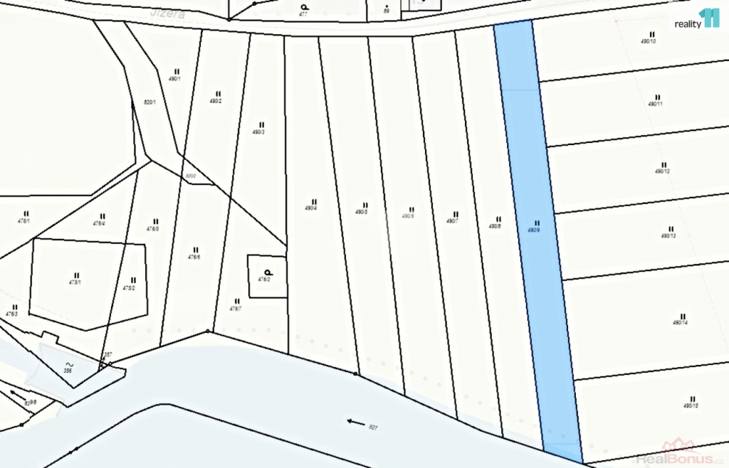 Podlouhlý cca 15 m široký pozemek ohraničuje z jedné strany místní komunikace a na opačném konci je přístup k řece Jizeře. O vývaziště pro loďky je vhodné požádat.