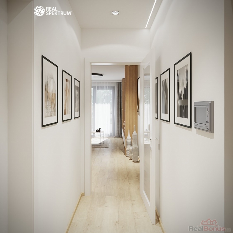 chodba (4,4 m2), obývací pokoj s kuchyňským koutem (25,3 m2), pokoj (16,9 m2), koupelna s WC (4,9 m2), terasa (10,3 m2), sklep