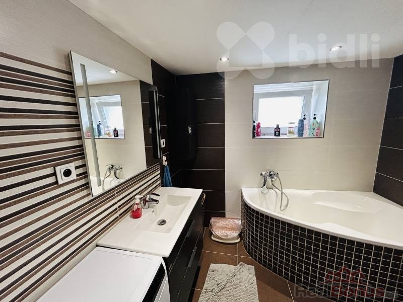 rodinná část 3+kk s velkým obývacím pokojem, prostornou kuchyní s jídelnou a originálním průhledem přes zabudované akvárium, koupelna s rohovou vanou a sprchovým koutem, samostatné WC, technická místnost, dva průchozí pokoje
