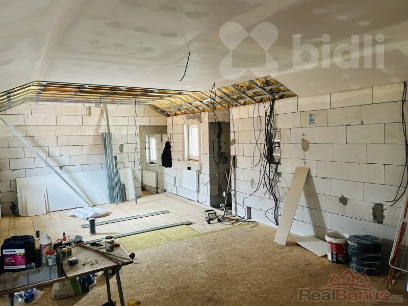 Patro - před dokončením; dispozici lze upravit podle přání kupujícího. Plánováno 3 pokoje, koupelna s WC a herna. Možnost dohody s majitelem na kompletním dokončení.