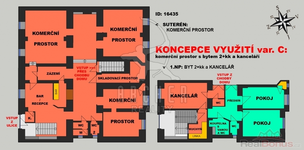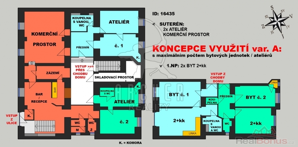 Suterénní prostor je vhodný pro široké spektrum komerčních činností nebo jako reprezentativní sídlo firmy. Možné je provozování restaurace, baru, klubu nebo jej lze rekonstruovat na prodejnu, kancelářské prostory, grafické studio, pro služby atd. atp.