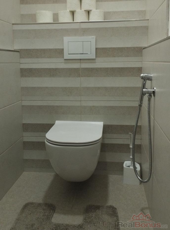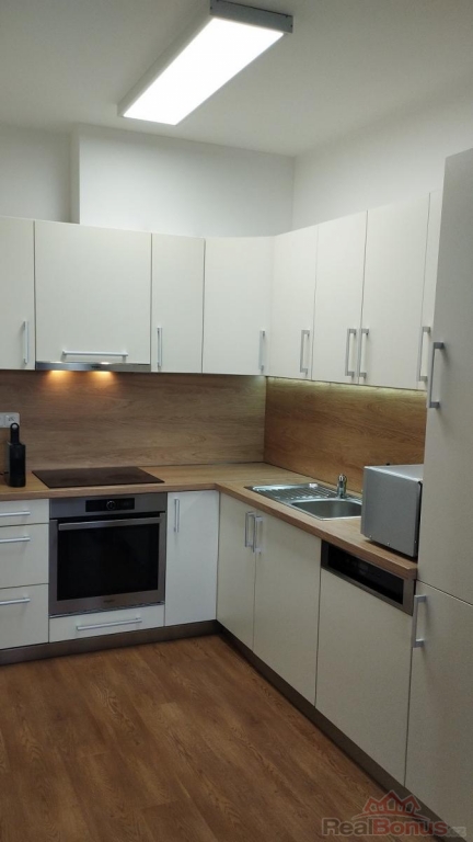Dispozice: vstupní chodba s vestavnými skříněmi, koupelna s vanou a přípojkou na pračku, samostatné WC, samostatné vstupy do ložnice a obývacího pokoje s kuchyňským koutem s plně vybavenou kuchyňskou linkou: myčka, mikrovlnná trouba, elektrická trouba se sklokeramickou deskou, odsavač par, lednice s mrazákem. Z obývacího pokoje je vstup na balkon s výhledem na jižní stranu do zahrad RD.