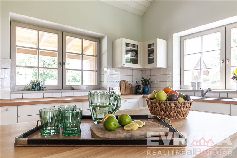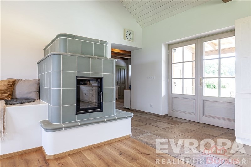 Přízemí: velkorysý obytný prostor s kuchyní, jídelnou a obývákem, kde centrem dění jsou kachlová kamna s lavicí na ležení a akumulací tepla na celý den. Z obývacího pokoje vyjdete přímo na slunnou terasu, odkud si můžete vychutnat rána v naprostém tichu. Dále prostorná koupelna a dva pokoje.