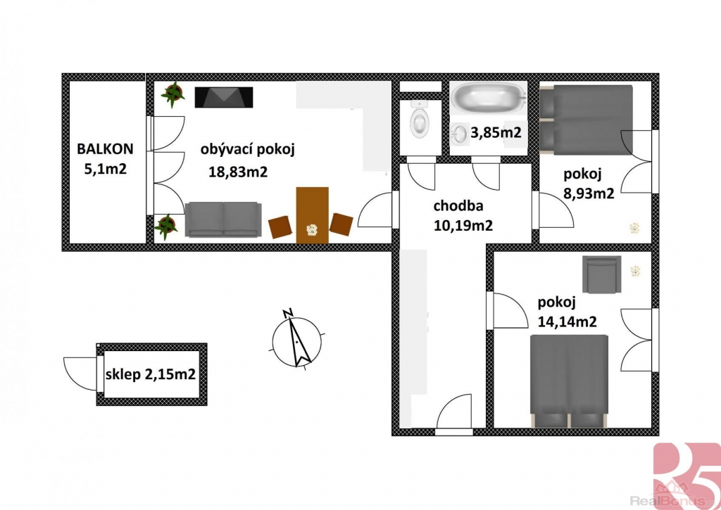 Vstupte do prostorné centrální chodby, která je vybavena šatní skříní a poskytuje dostatek místa pro uložení vašich věcí. Byt se skládá ze dvou samostatných ložnic o velikosti 8,93 m2 a 14,14 m2. Obývací pokoj o rozloze 18,83 m2 je ideálním místem pro rodinné chvíle a relaxaci, a navíc z něj můžete vyjít na balkon o velikosti 5,1 m2, kde si můžete vychutnat ranní kávu nebo večerní posezení s výhledem do zeleně.