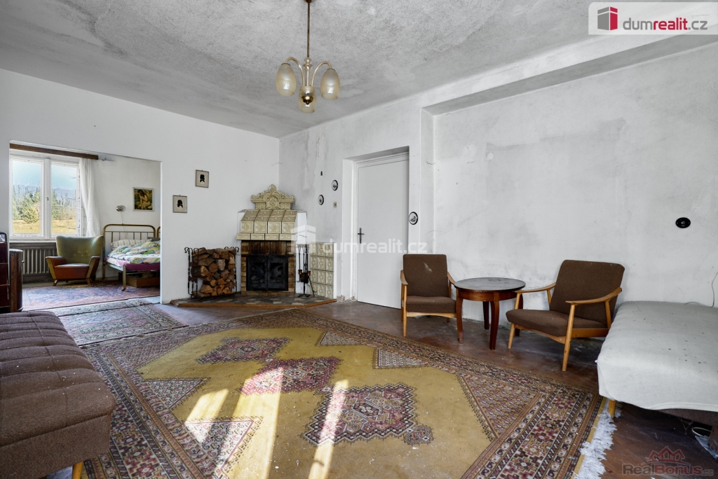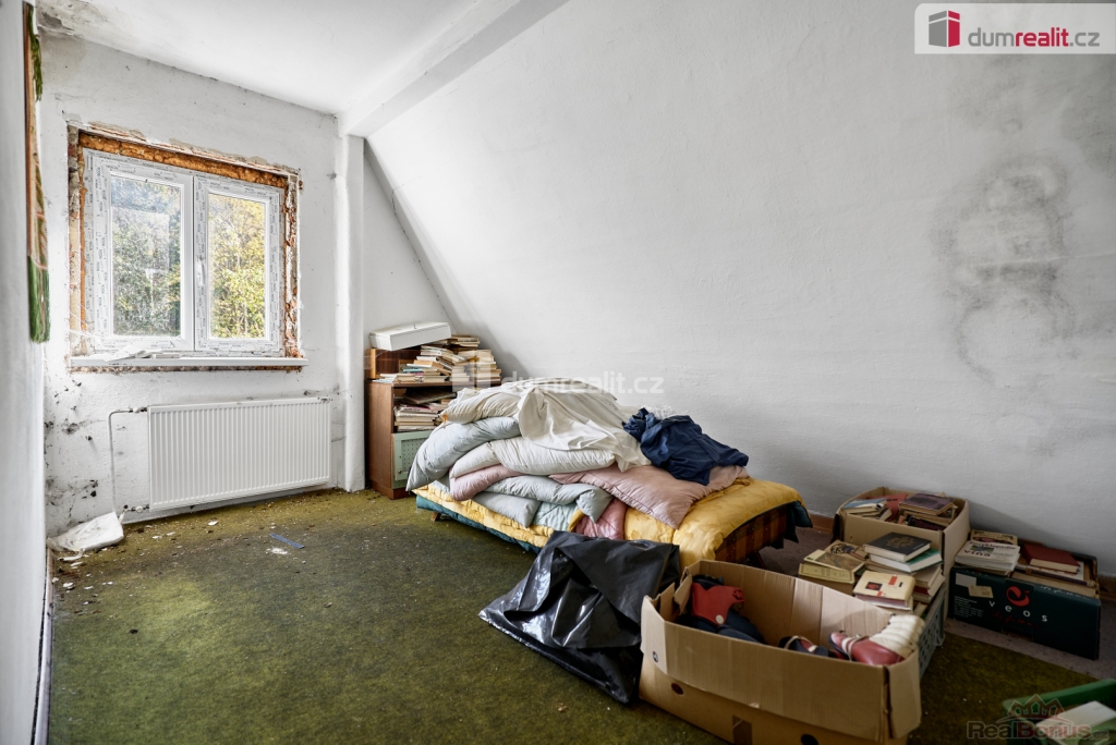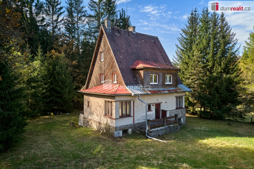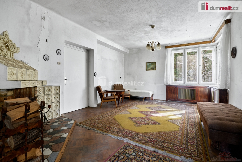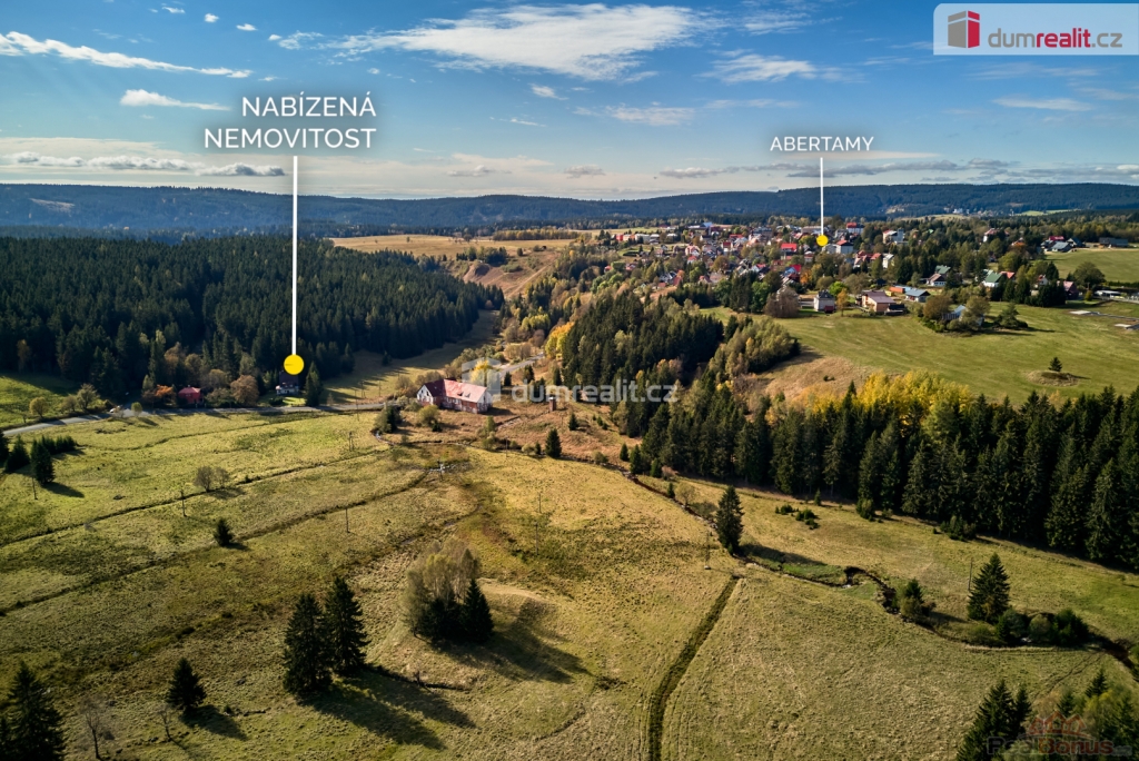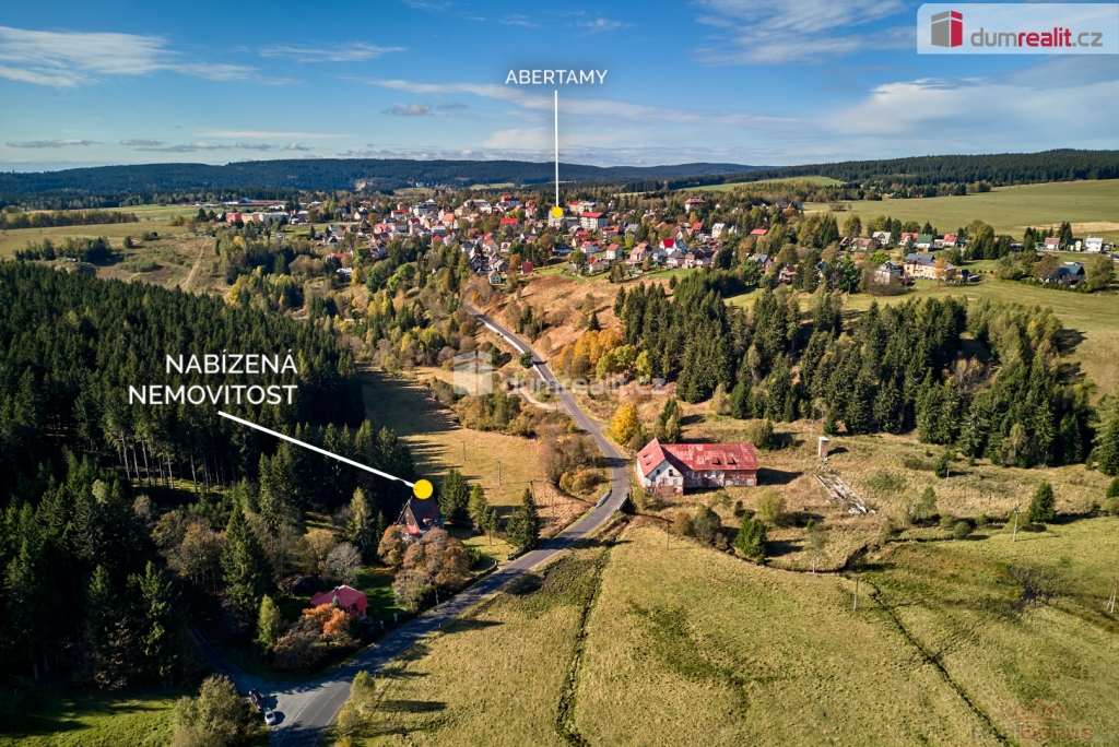 Při rychlém jednání dohoda možná. , Dumrealit.cz Vám zprostředkuje prodej rodinného domu 5+1 ve městě Abertamy v Krušných horách. Dům se nachází na pozemku o celkové výměře 2.486 m, v klidné části obce s překrásným výhledem na přírodu. Tento zděný dům je dvoupodlažní, celopodsklepený s podlahovou plochou 150 m. Dům leží nedaleko samotného centra města Abertamy, přesto je v pěkném a klidném prostředí. V přízemí se nachází: zádveří, chodba, hala vč. schodiště, prostorný obývací pokoj s krbovými kamny, ložnice, kuchyně, koupelna s WC a vstup do sklepa. V podkroví se nachází: chodba, obývací pokoj s krbovými kamny a vstupem na balkon, ložnice, kuchyně, koupelna s WC a vstup na půdu. Dům disponuje půdním prostorem vhodným pro vybudování dalších obytných místností. Možnost parkování vozů na vlastním pozemku. Nemovitost je v původním stavu, vhodná k celkové rekonstrukci. Dle územního plánu města Abertamy se zde nabízí možnost vybudování: 1) rodinného domu 2) bytového domu 3) řadového domu 4) dvojdomů nebo další přípustná využití dle ÚP. Město Abertamy stojí v Krušných horách v nadmořské výšce okolo 900 metrů. Abertamy vám umožní bohaté celoroční sportovní vyžití. Upravené cyklostezky, turistické trasy, v zimě pak udržované běžecké tratě nebo nedaleké lyžařské areály (Plešivec 2,5 km, Boží Dar 9 km, Klínovec 13 km). Při rychlém jednání dohoda o ceně možná. Nemovitost lze financovat hypotečním úvěrem, který Vám rádi pomůžeme zajistit v našem hypotečním centru. Vzhledem k tomu, že před zadáním do inzerce nebyl vyhotoven energetický průkaz, je tato nemovitost v souladu s platnou legislativou zařazena do energetické třídy G. Ev. číslo: 648839. Energetický štítek: G