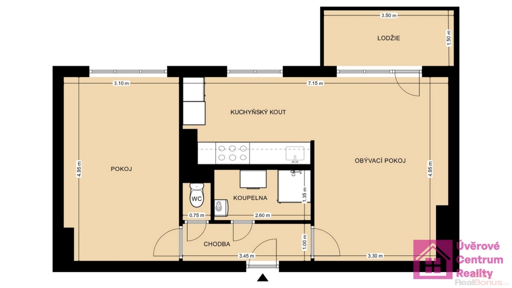 Dispozice bytu: předsíň, pokoj, toaleta, koupelna (sprchový kout), kuchyň, pokoj s přístupem na balkón. Půdorys bytu naleznete ve fotogalerii.