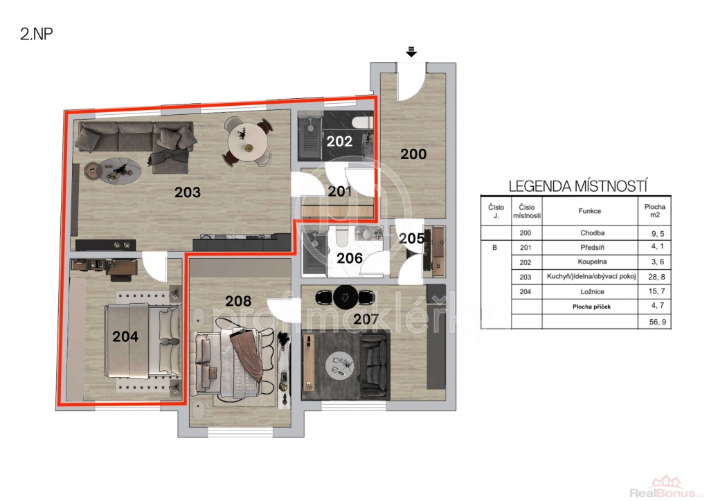 Ve výhradním zastoupení majitele nabízím MODERNÍ BYT 2+kk o podlahové ploše 56,9m2. Výměra zahrnuje obývací pokoj s kuchyňským koutem a dvěma francouzkými okny, ložnici, předsíň a koupelnu s toaletou. K bytu dále náleží nádherná terasa orientovaná do zahrady, 13m2, na kterou je přímý vstup z obývacího pokoje a ze které je následně přístupná zahrada s výměrou 40 m2. Na uložení sezonních věcí poslouží sklad 3m2. U parkovacího stání před domem bude připravena přípojka pro dobíjení elektromobilu patřící výhradně pro tento byt.
